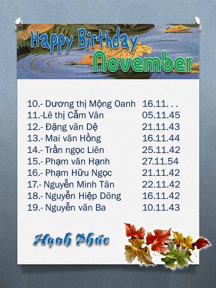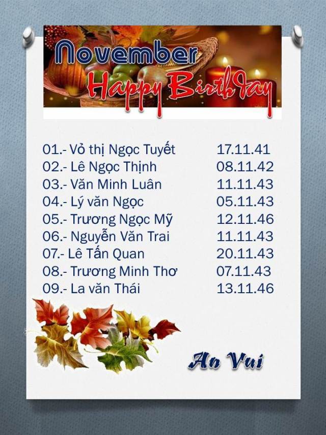 Trong tháng 11 nầy có rất nhiều bạn được Happy Birthday từ CNN. Thành thật cám ơn  anh Trưởng K1 đã gởi cho CNN bản SVL tuyển dụng đầu tiên nầy.                                                                Đặc biệt tháng nầy CNN xin gởi đến một video ngắn về ngày sinh nhật của Nguyễn công Vinh vui cùng một số bạn trong đó có đại diện của K1, rất tiếc hôm đó anh trưởng K1 vì bận đi làm nên không đến được. Và nhân dip bần nhân nầy đến Cali bạn Huỳnh Vĩnh Hưng lần đầu tiên đã dẫn vợ giới thiệu đến anh em chúng ta. Xin mời tất cả các bạn cùng thưởng thức.