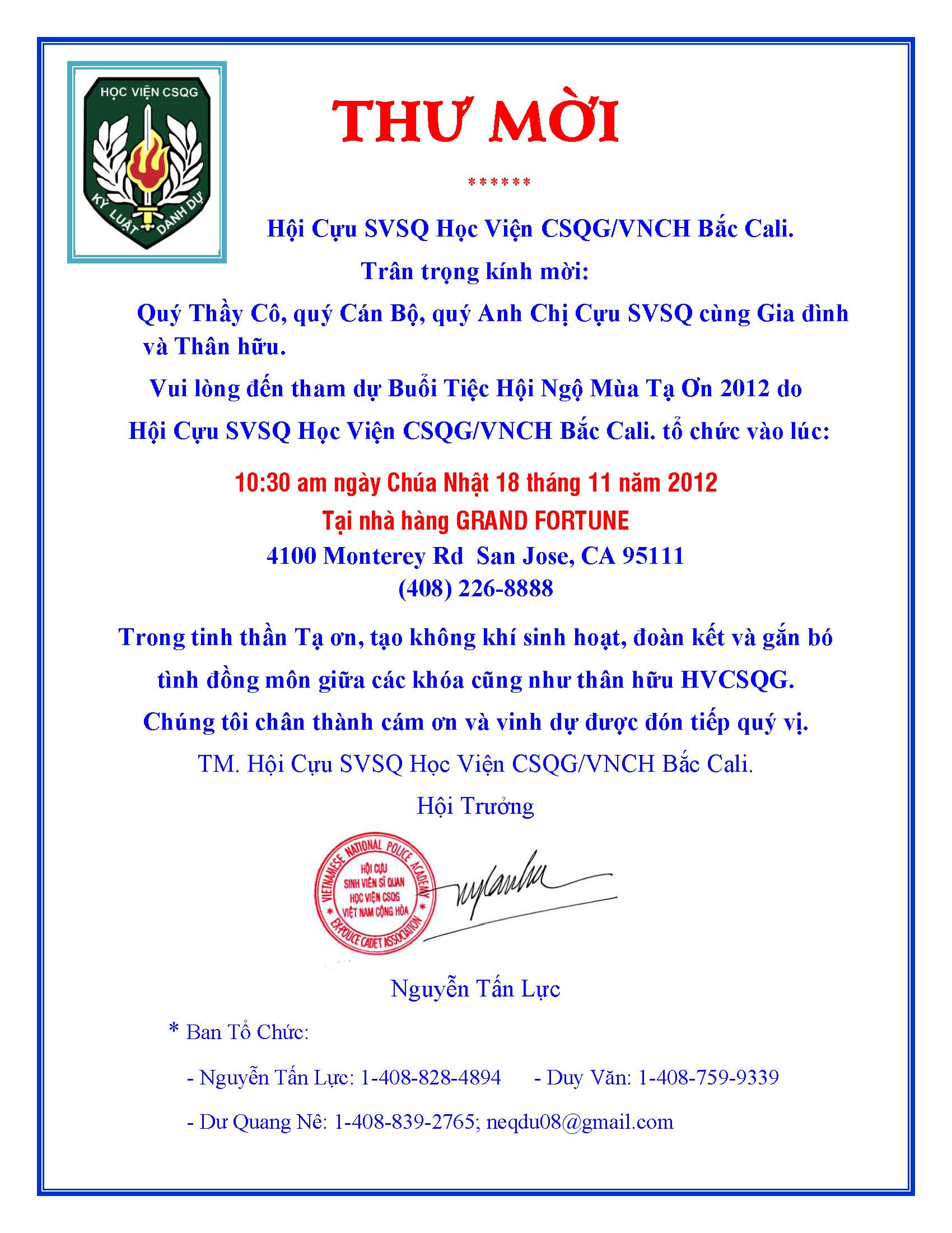 Thư Mời Dự Dạ Tiệc Mùa Tạ Ơn 2012 của Hội Ái Hữu Cựu SVSQ- HV CSQG-VNCB- Bắc Cali