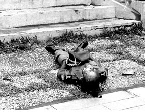 Giải phóng quân đã đổ đầy trước thềm Hạ Viện. Cỏ đuôi chó hoan hô tưng bừng. Dân chúng chiêm ngưỡng Trung Tá Long tản mạn. Trung Tá Long nằm nguyên chỗ ông ngã rạp cho máu rửa nhục Sài gòn.