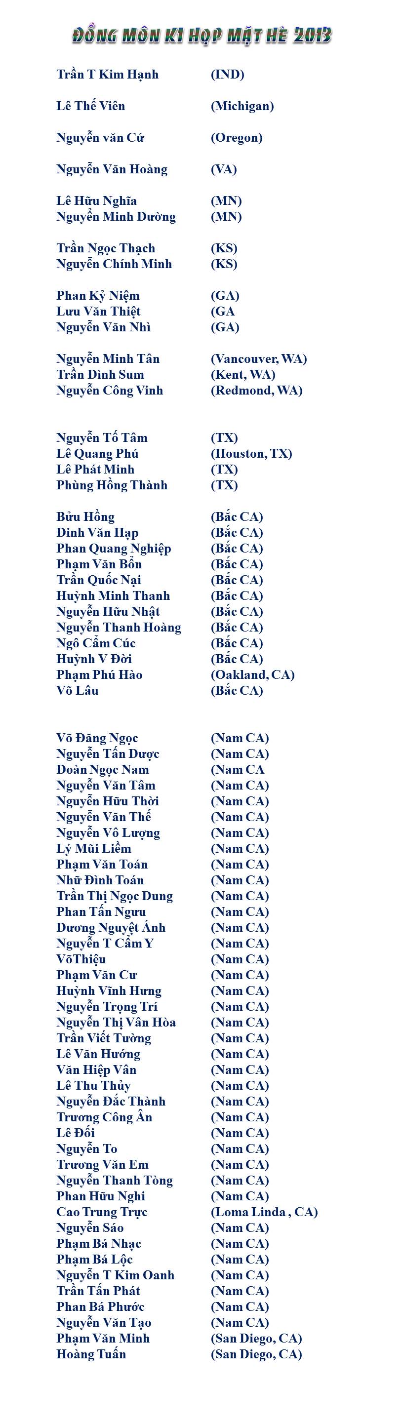 Sau đây là danh sách các bạn đồng môn K1 về dự Ngày Họp Mặt K1 Hè 2013. Không biết có còn thiếu bạn nào không. Nếu có thì chúng tôi xin lỗi và xin bạn báo cho CNN biết để ghi lại cho đầy đủ. Mến chúc sức khỏe dến tất cả các bạn.
