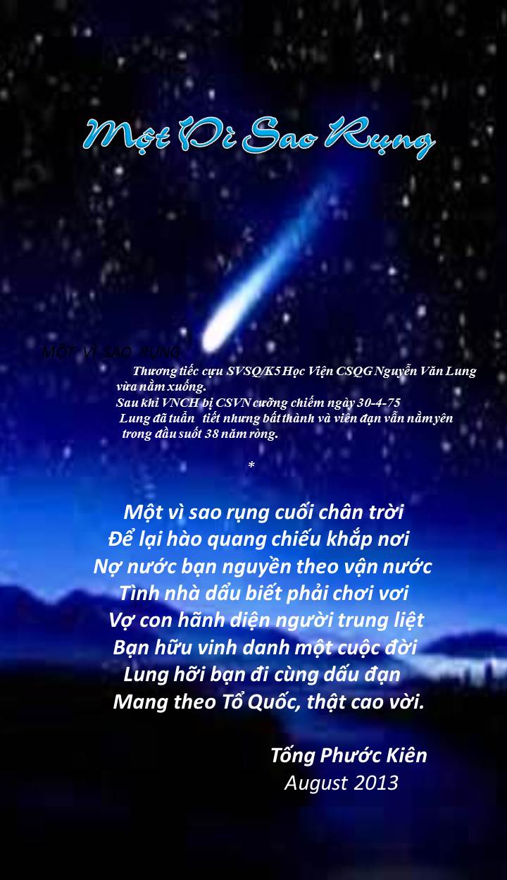 Hay tin chiến hữu Cảnh sát, cựu SVSQ Khóa 5 Học Viện CSQG VNCH anh Nguyễn văn Lung vừa từ trần, K1 Tống Phước Kiên có  gởi đến chúng tôi bài thơ “Một Vì Sao Rụng” dưới đây để ca ngợi người anh hùng Nguyễn Văn Lung bất khuất không chấp nhận sống chung cùng Cộng sản.