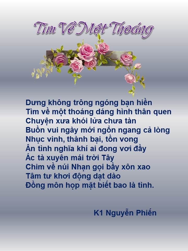 Bài thơ “Tìm Về Một Thoáng” của K1 Nguyễn Phiến gởi cho CNN đã lâu, nhưng nằm trong phần “Phản ảnh” nên không biết. Hôm nay tình cờ mở ra thấy bài thơ của bạn, nên vội vã post lên đây. Bài thơ rất hay rất có ý nghĩa. Xin lỗi bạn Nguyễn Phiến về sự trể nãi nầy.
