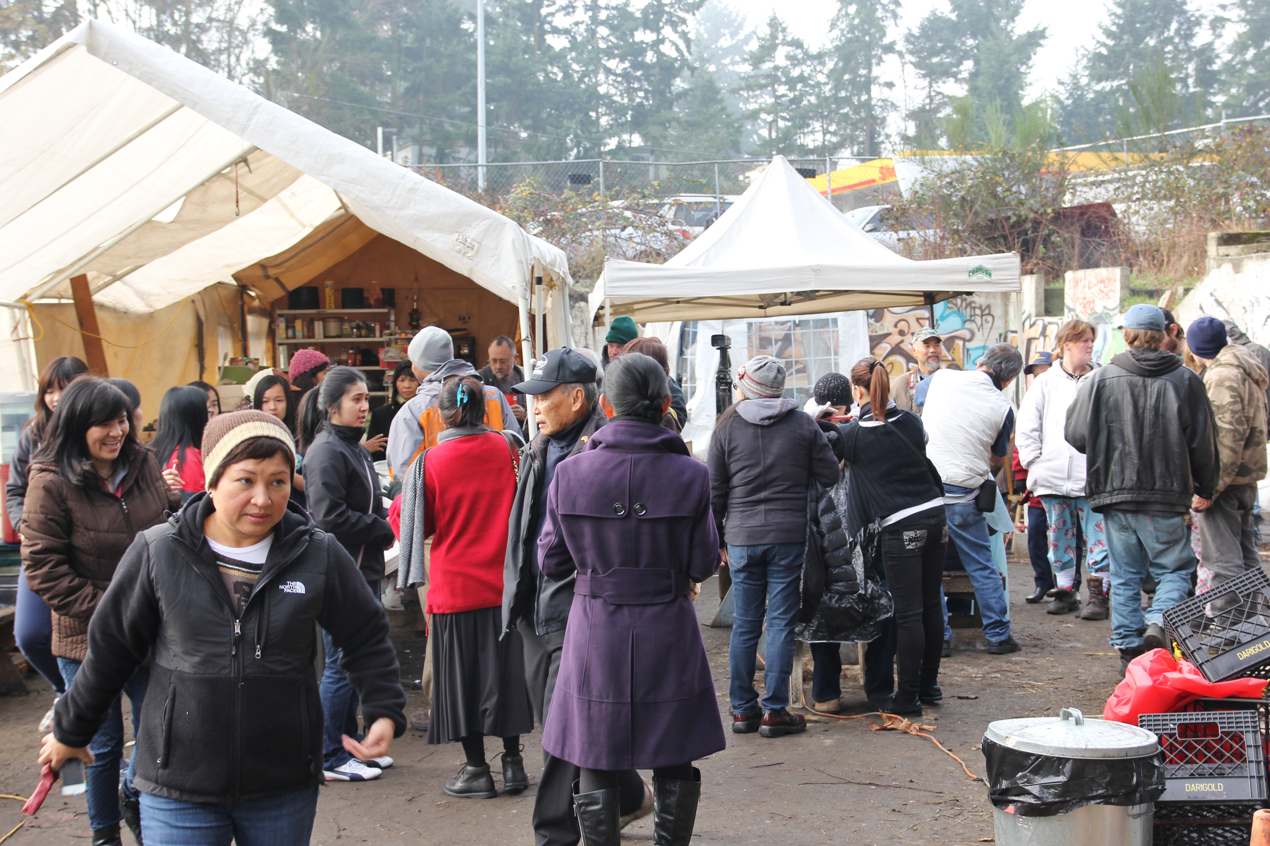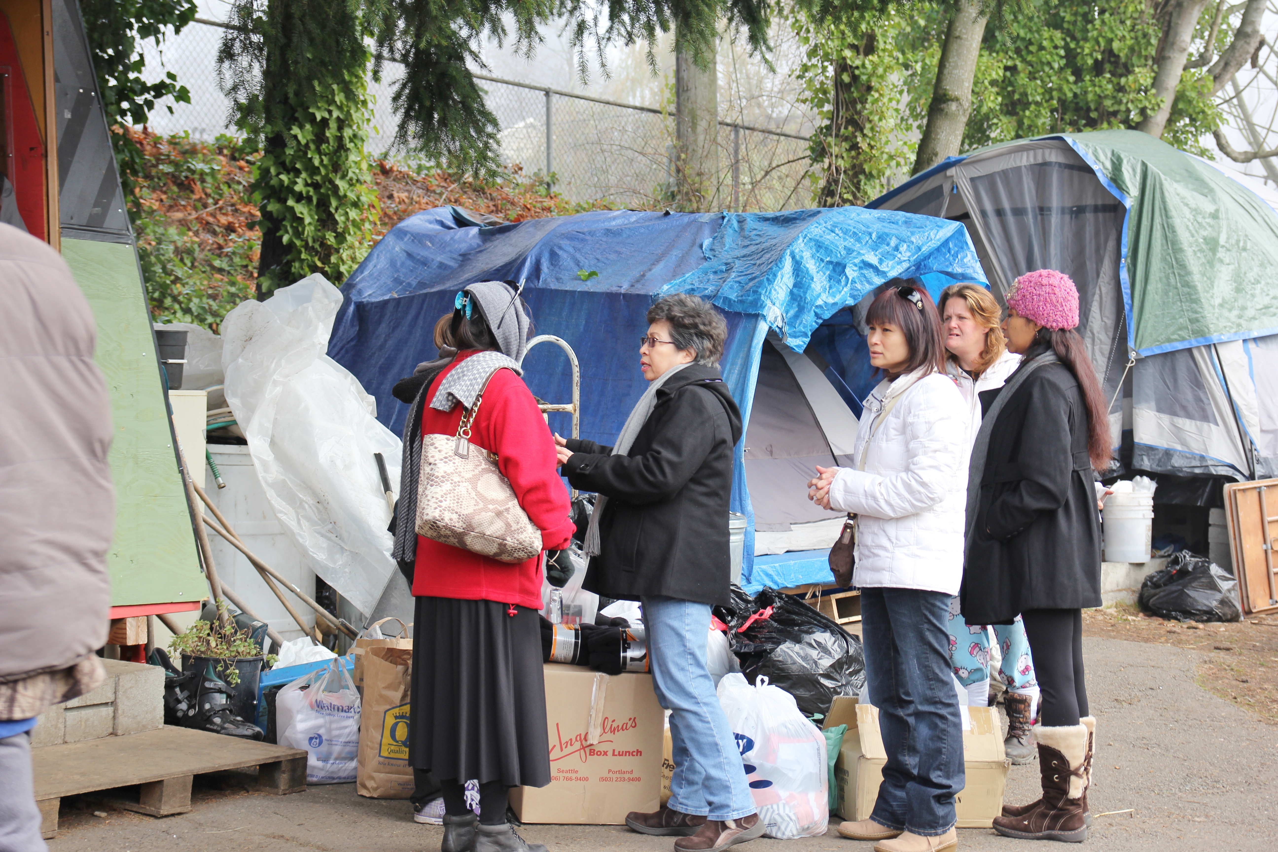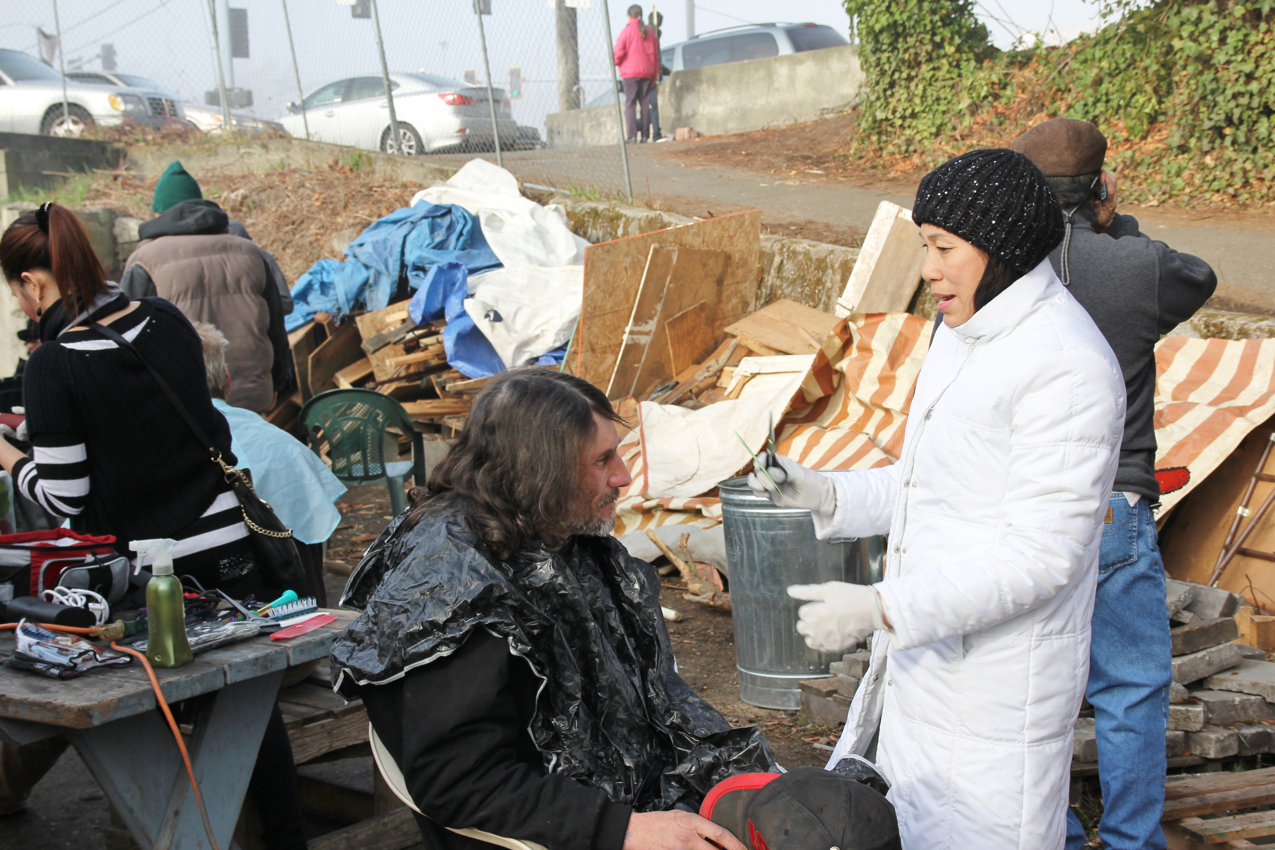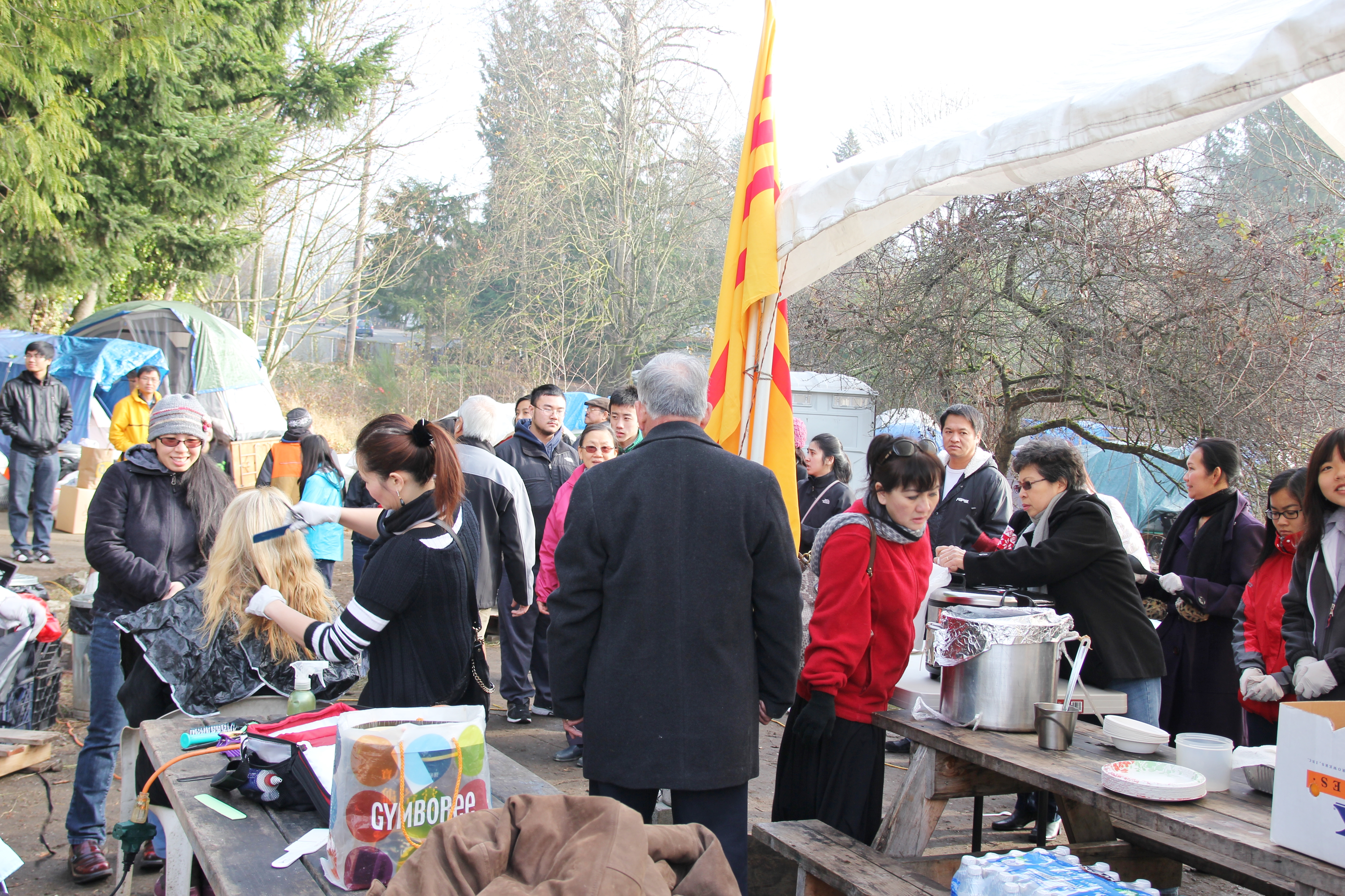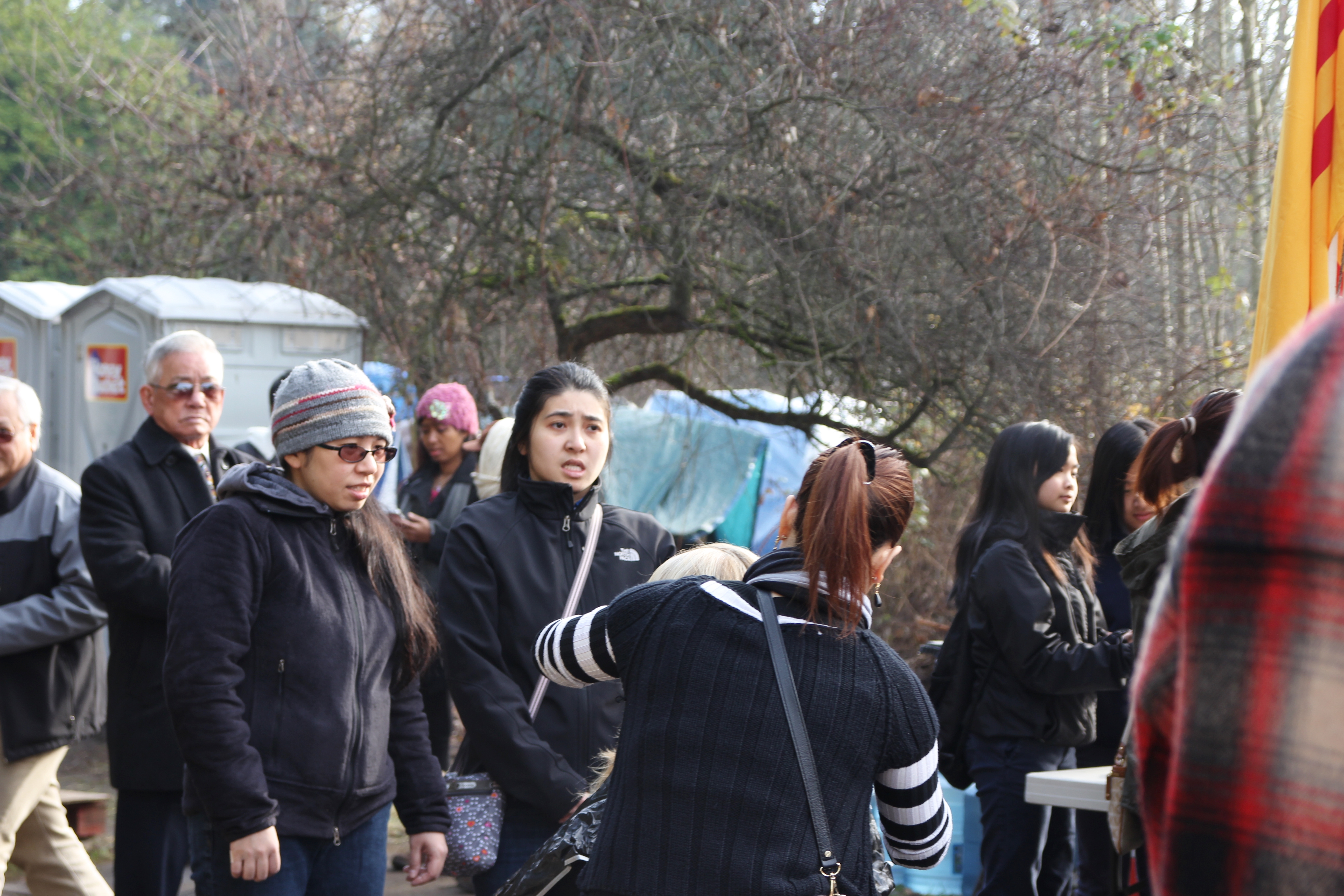 Hôm nay trời rất lạnh, sương mù che kín các túp lều thấp lè tè trên một miếng đất hẹp, chật chội, ẩm ướt. Nhìn vài tấm lều mình không thấy gì ngoài một tấm nệm và một tấm đắp, không điện đốm, không bếp nước. Tại nơi trung tâm có một thùng lớn họ đốt củi rồi thỉnh thoảng lại ngổi trên mấy cái ghế cũ kỷ bẩn thiểu để sưởi ấm. Trong đoàn có vài tình nguyện viên hớt tóc, tỉa râu cho người homeless. Món chã giò chay mà bà xã mình và người bạn hùn làm được chiếu có nhất, còn cơm thì có người thích người không. Thấy họ thật tội nghiệp, nếu mình ở trong hoàn cảnh nầy thì chết mất , không thể nào chịu được cái lạnh về đêm ở vùng Tây Bắc nầy. Bà con người Việt mình tới tham cũng đông, có người tới thăm cho biết , có người đem theo áo quần đố ấm, thức ăn khô…nhưng người nào cũng mặc hai ba lớp áo, trùm đầu mà còn run lập cập. Một anh bạn tâm sự ” Hồi tôi đi vượt biên, ở trong trại tỵ nạn sướng gấp trăm lần như thế nầy“. Mọi người đi thăm đều có chung cảm nghĩ: thay vì hoàn cảnh đó là của mình nếu còn sống ở Việt Nam. Bây giờ mình có cuộc sống tạm đủ và ấm cúng thì đất nước cưu mang chúng ta và tạo điều kiện cho con cháu chúng ta thành tài lại có những con người khốn khổ như thế nầy. Sáng nay có khoảng 30-40 cháu trong gia đình Phật tử Vạn Hạnh cùng tham dự. Chúng tôi muốn chỉ cho các cháu món ân tình mà cha mẹ các cháu đã mang, mong rằng các cháu đừng bao giờ quên và mỗi năm đến ngày Thanksgiving hảy cùng các cô chú bác, ông bà đi thăm các làng Homeless như thế nầy để chia xẽ nổi bất hạnh của những con người thiếu may mắn nầy.