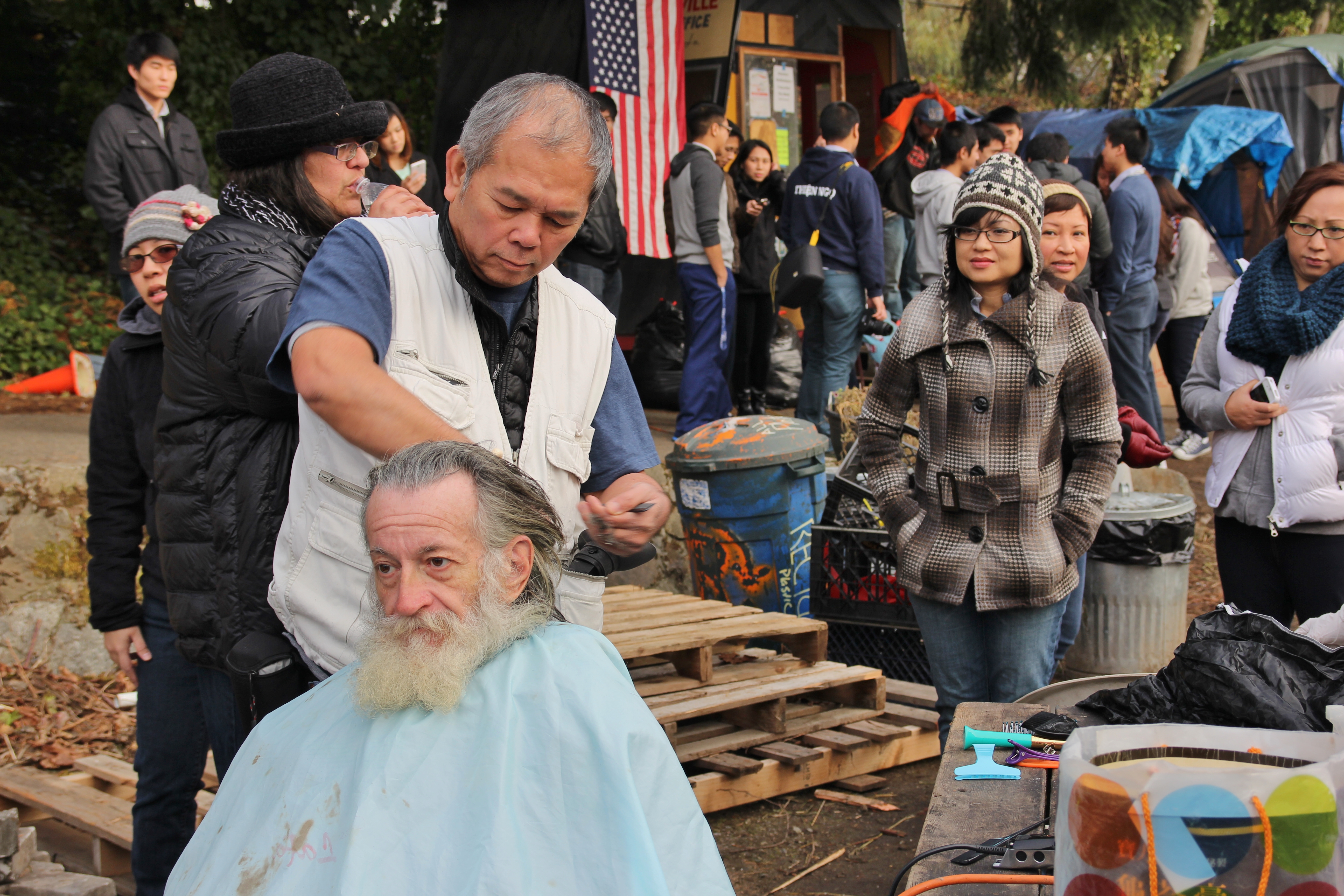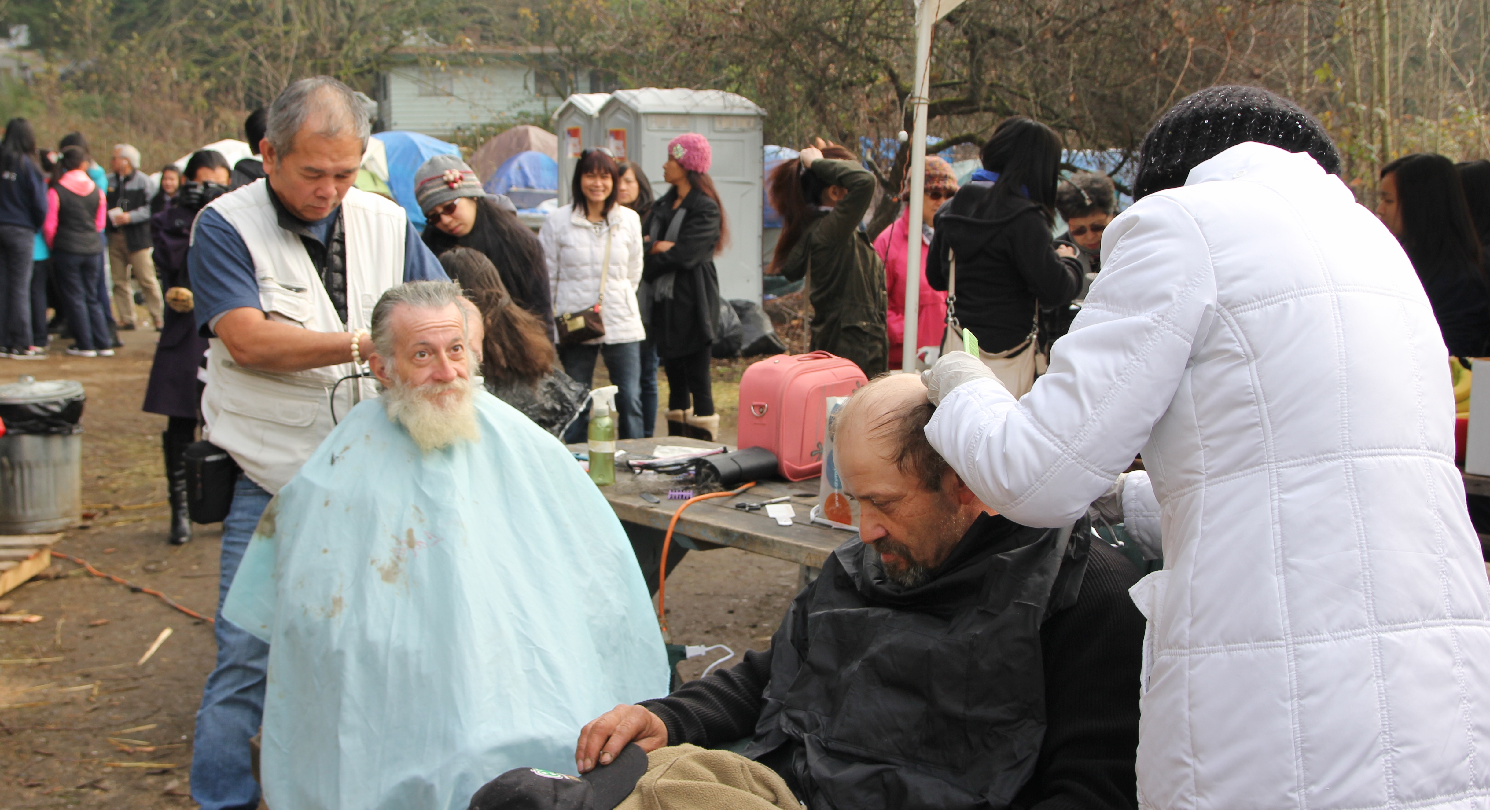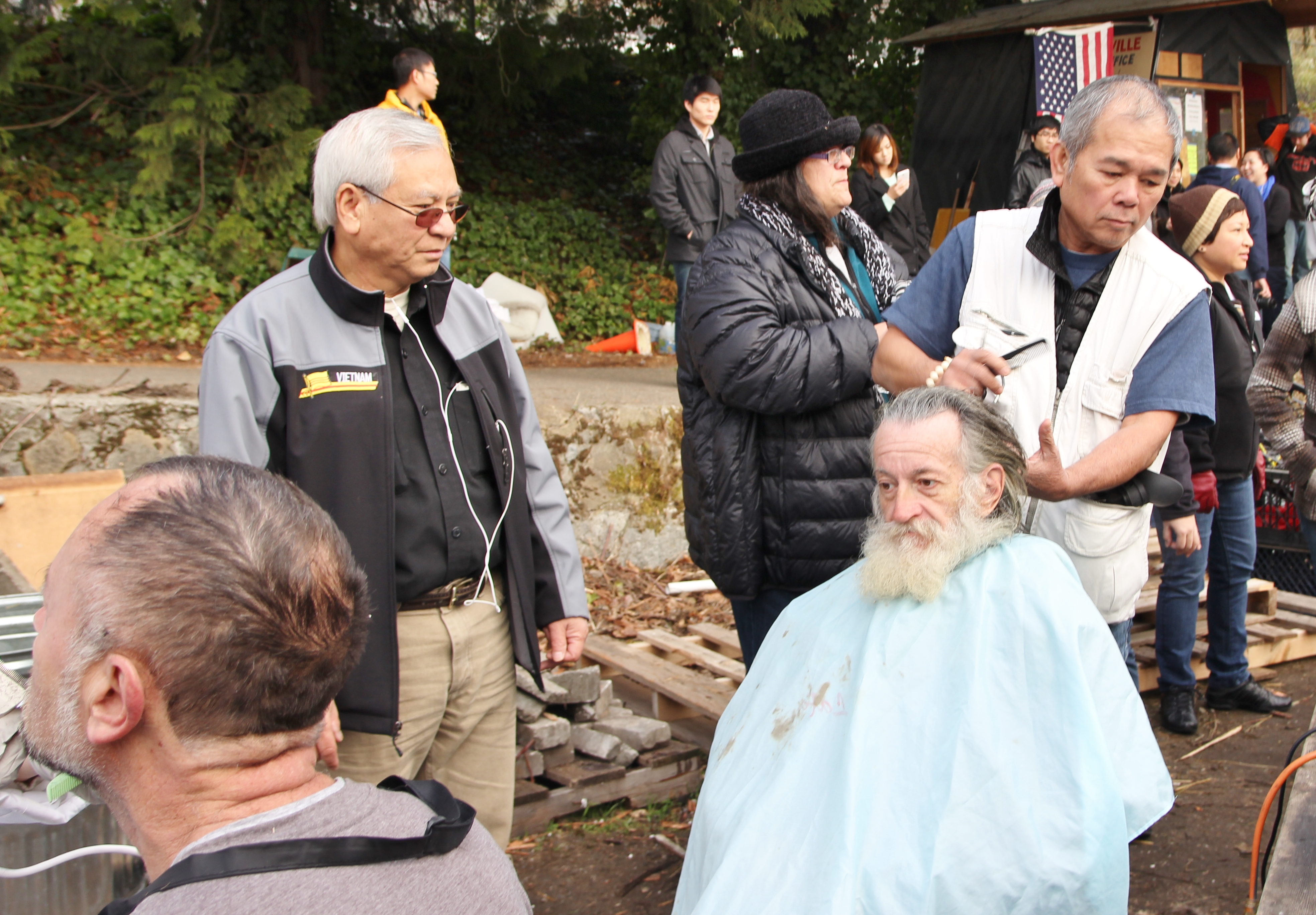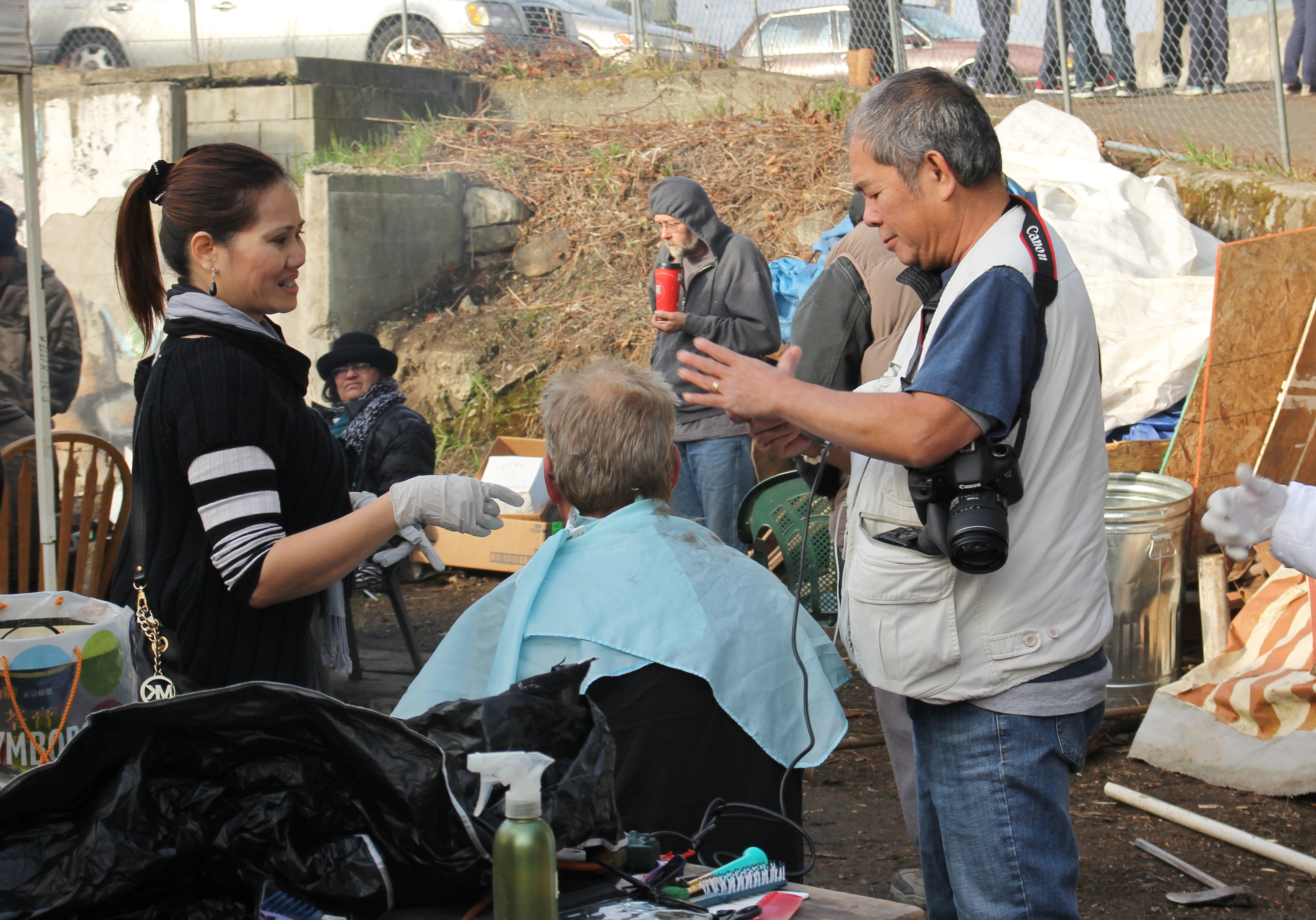 Hôm nay trời rất lạnh, sương mù che kín các túp lều thấp lè tè trên một miếng đất hẹp, chật chội, ẩm ướt. Nhìn vài tấm lều mình không thấy gì ngoài một tấm nệm và một tấm đắp, không điện đốm, không bếp nước. Tại nơi trung tâm có một thùng lớn họ đốt củi rồi thỉnh thoảng lại ngổi trên mấy cái ghế cũ kỷ bẩn thiểu để sưởi ấm. Trong đoàn có vài tình nguyện viên hớt tóc, tỉa râu cho người homeless. Món chã giò chay mà bà xã mình và người bạn hùn làm được chiếu có nhất, còn cơm thì có người thích người không. Thấy họ thật tội nghiệp, nếu mình ở trong hoàn cảnh nầy thì chết mất , không thể nào chịu được cái lạnh về đêm ở vùng Tây Bắc nầy. Bà con người Việt mình tới tham cũng đông, có người tới thăm cho biết , có người đem theo áo quần đố ấm, thức ăn khô…nhưng người nào cũng mặc hai ba lớp áo, trùm đầu mà còn run lập cập. Một anh bạn tâm sự ” Hồi tôi đi vượt biên, ở trong trại tỵ nạn sướng gấp trăm lần như thế nầy“. Mọi người đi thăm đều có chung cảm nghĩ: thay vì hoàn cảnh đó là của mình nếu còn sống ở Việt Nam. Bây giờ mình có cuộc sống tạm đủ và ấm cúng thì đất nước cưu mang chúng ta và tạo điều kiện cho con cháu chúng ta thành tài lại có những con người khốn khổ như thế nầy. Sáng nay có khoảng 30-40 cháu trong gia đình Phật tử Vạn Hạnh cùng tham dự. Chúng tôi muốn chỉ cho các cháu món ân tình mà cha mẹ các cháu đã mang, mong rằng các cháu đừng bao giờ quên và mỗi năm đến ngày Thanksgiving hảy cùng các cô chú bác, ông bà đi thăm các làng Homeless như thế nầy để chia xẽ nổi bất hạnh của những con người thiếu may mắn nầy.