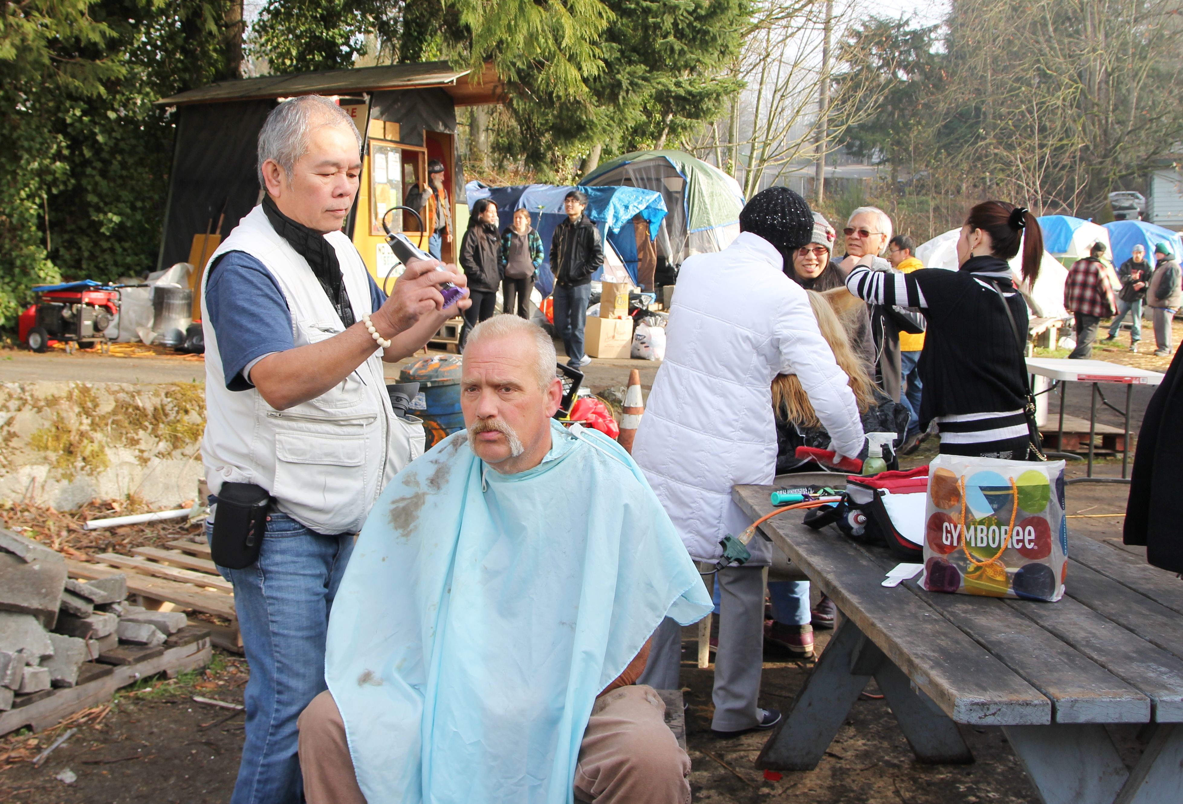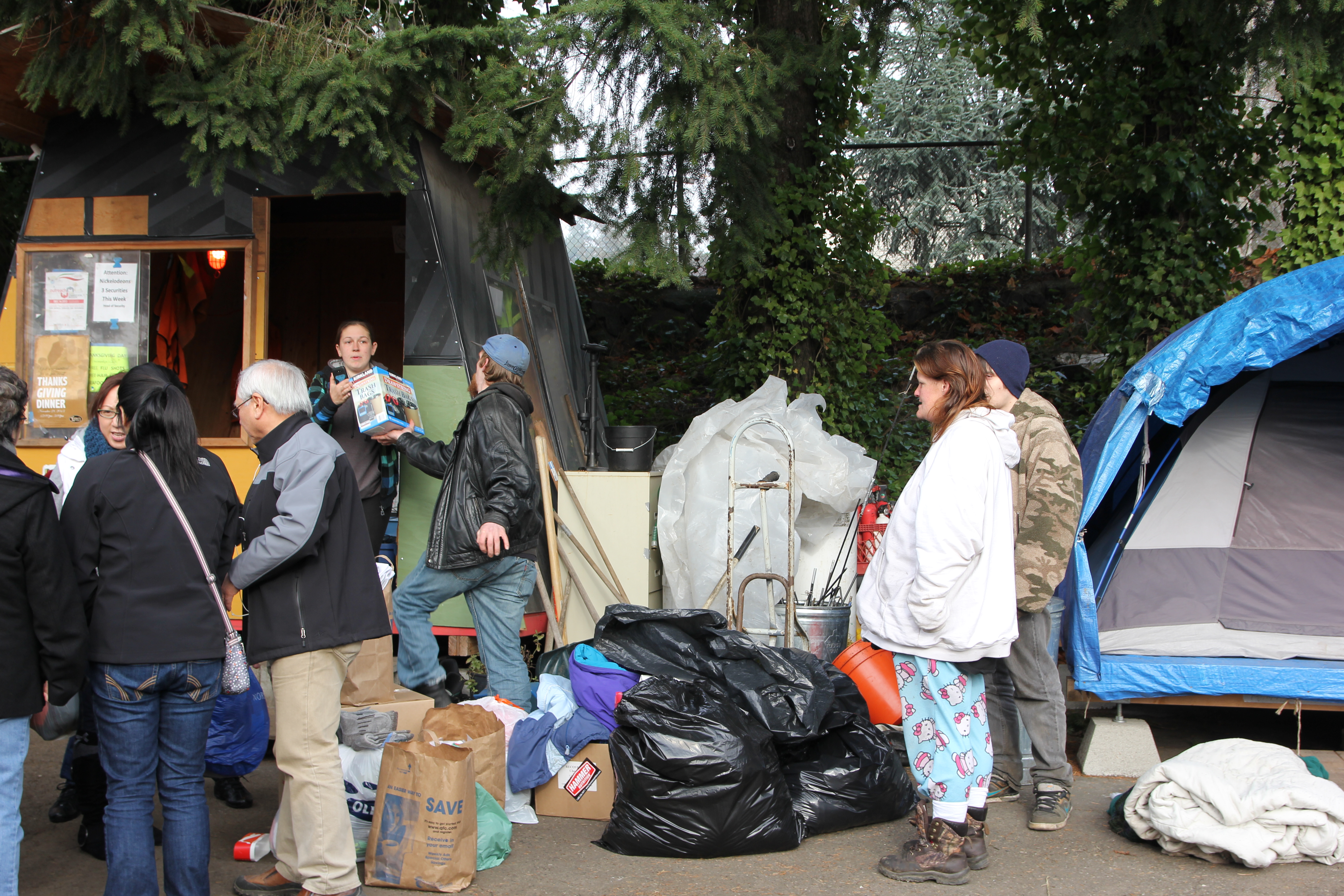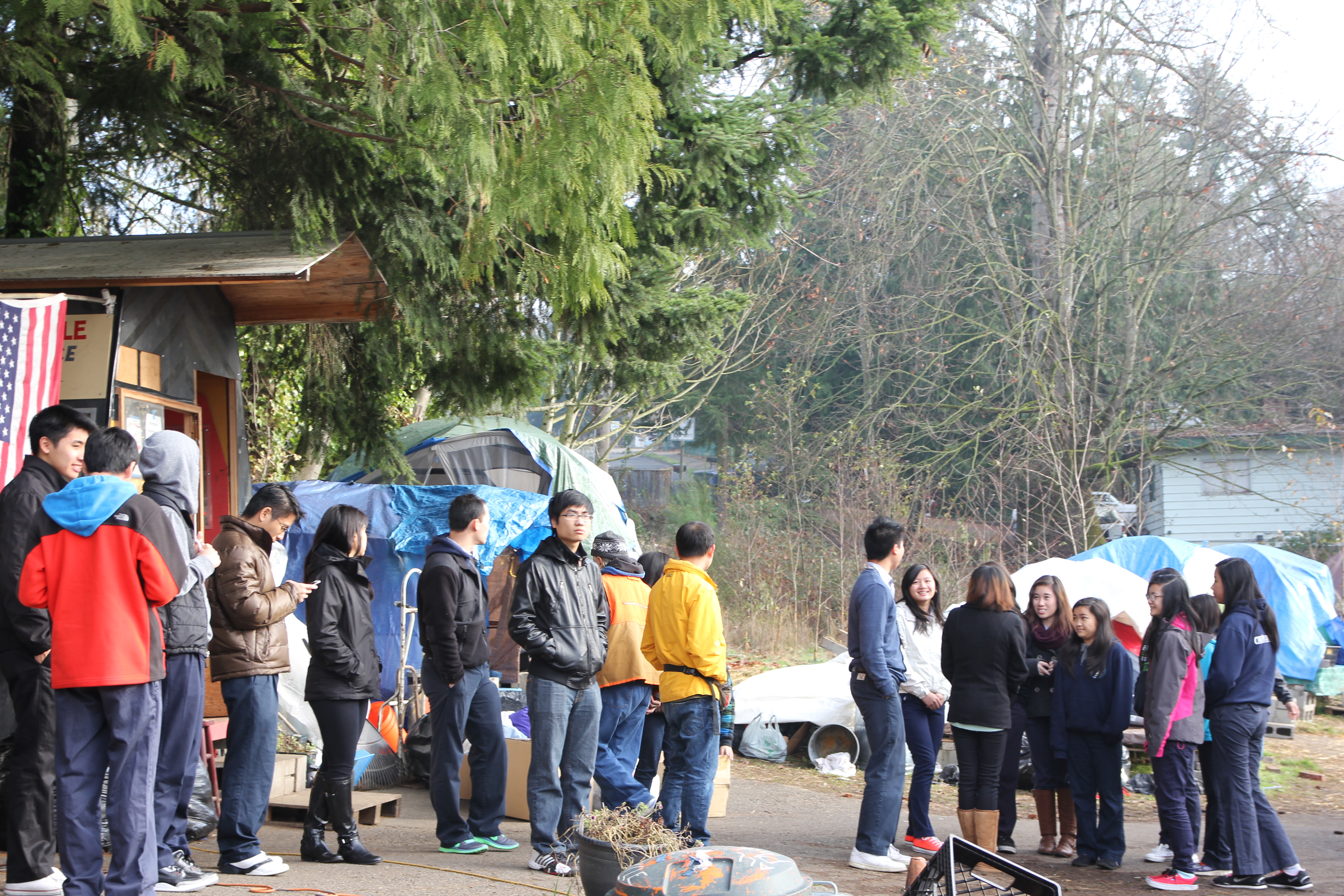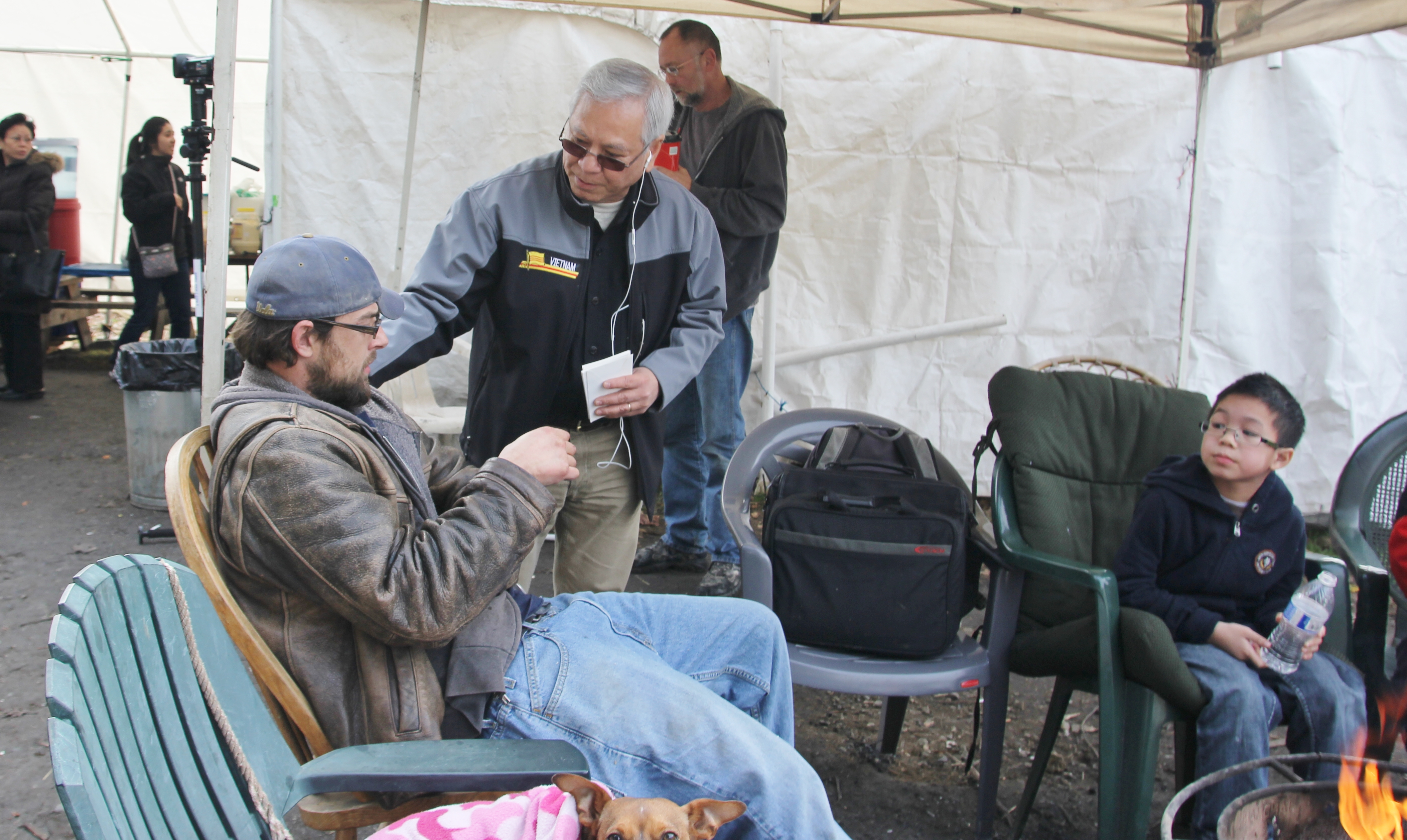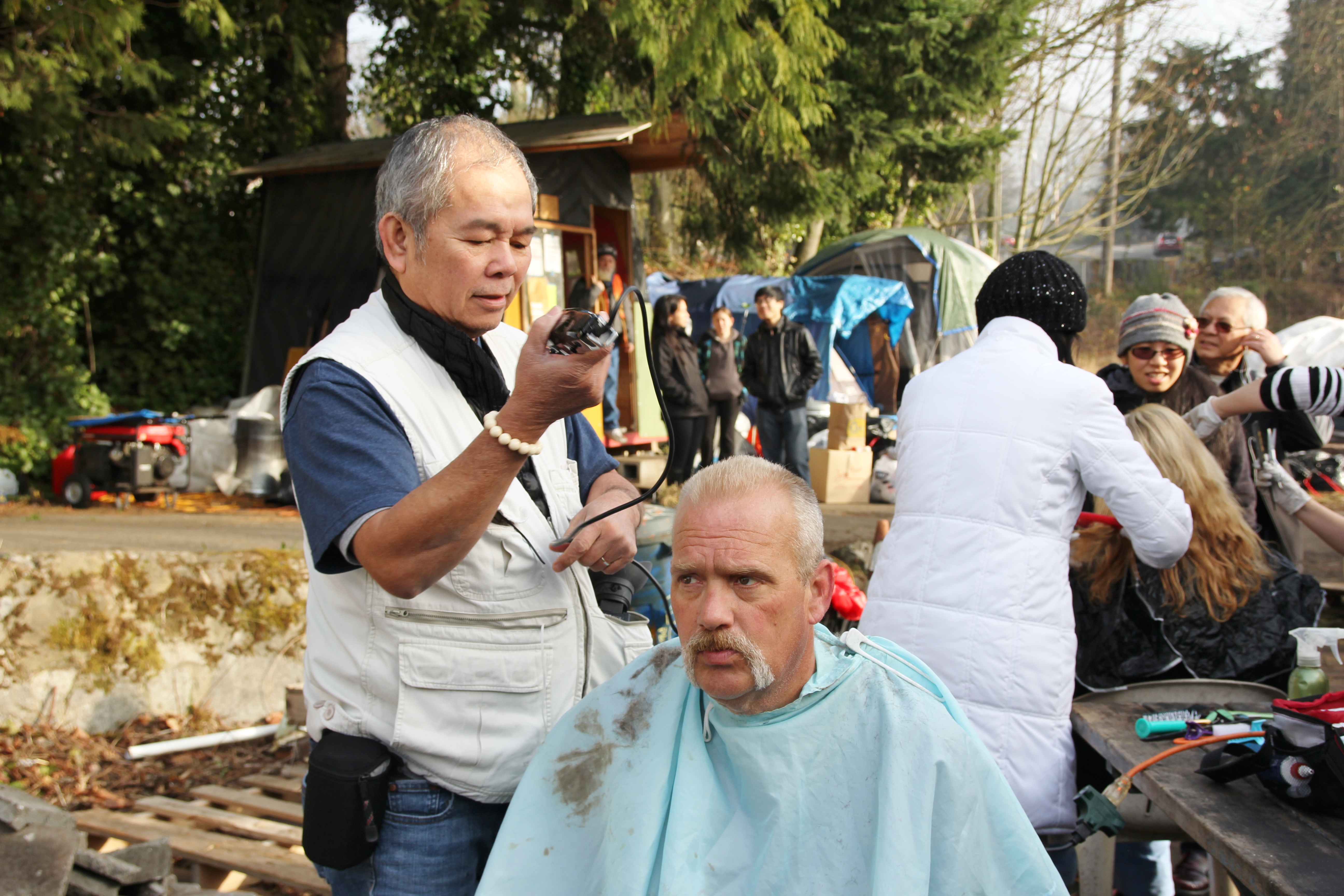 Hôm nay trời rất lạnh, sương mù che kín các túp lều thấp lè tè trên một miếng đất hẹp, chật chội, ẩm ướt. Nhìn vài tấm lều mình không thấy gì ngoài một tấm nệm và một tấm đắp, không điện đốm, không bếp nước. Tại nơi trung tâm có một thùng lớn họ đốt củi rồi thỉnh thoảng lại ngổi trên mấy cái ghế cũ kỷ bẩn thiểu để sưởi ấm. Trong đoàn có vài tình nguyện viên hớt tóc, tỉa râu cho người homeless. Món chã giò chay mà bà xã mình và người bạn hùn làm được chiếu có nhất, còn cơm thì có người thích người không. Thấy họ thật tội nghiệp, nếu mình ở trong hoàn cảnh nầy thì chết mất , không thể nào chịu được cái lạnh về đêm ở vùng Tây Bắc nầy. Bà con người Việt mình tới tham cũng đông, có người tới thăm cho biết , có người đem theo áo quần đố ấm, thức ăn khô…nhưng người nào cũng mặc hai ba lớp áo, trùm đầu mà còn run lập cập. Một anh bạn tâm sự ” Hồi tôi đi vượt biên, ở trong trại tỵ nạn sướng gấp trăm lần như thế nầy“. Mọi người đi thăm đều có chung cảm nghĩ: thay vì hoàn cảnh đó là của mình nếu còn sống ở Việt Nam. Bây giờ mình có cuộc sống tạm đủ và ấm cúng thì đất nước cưu mang chúng ta và tạo điều kiện cho con cháu chúng ta thành tài lại có những con người khốn khổ như thế nầy. Sáng nay có khoảng 30-40 cháu trong gia đình Phật tử Vạn Hạnh cùng tham dự. Chúng tôi muốn chỉ cho các cháu món ân tình mà cha mẹ các cháu đã mang, mong rằng các cháu đừng bao giờ quên và mỗi năm đến ngày Thanksgiving hảy cùng các cô chú bác, ông bà đi thăm các làng Homeless như thế nầy để chia xẽ nổi bất hạnh của những con người thiếu may mắn nầy.