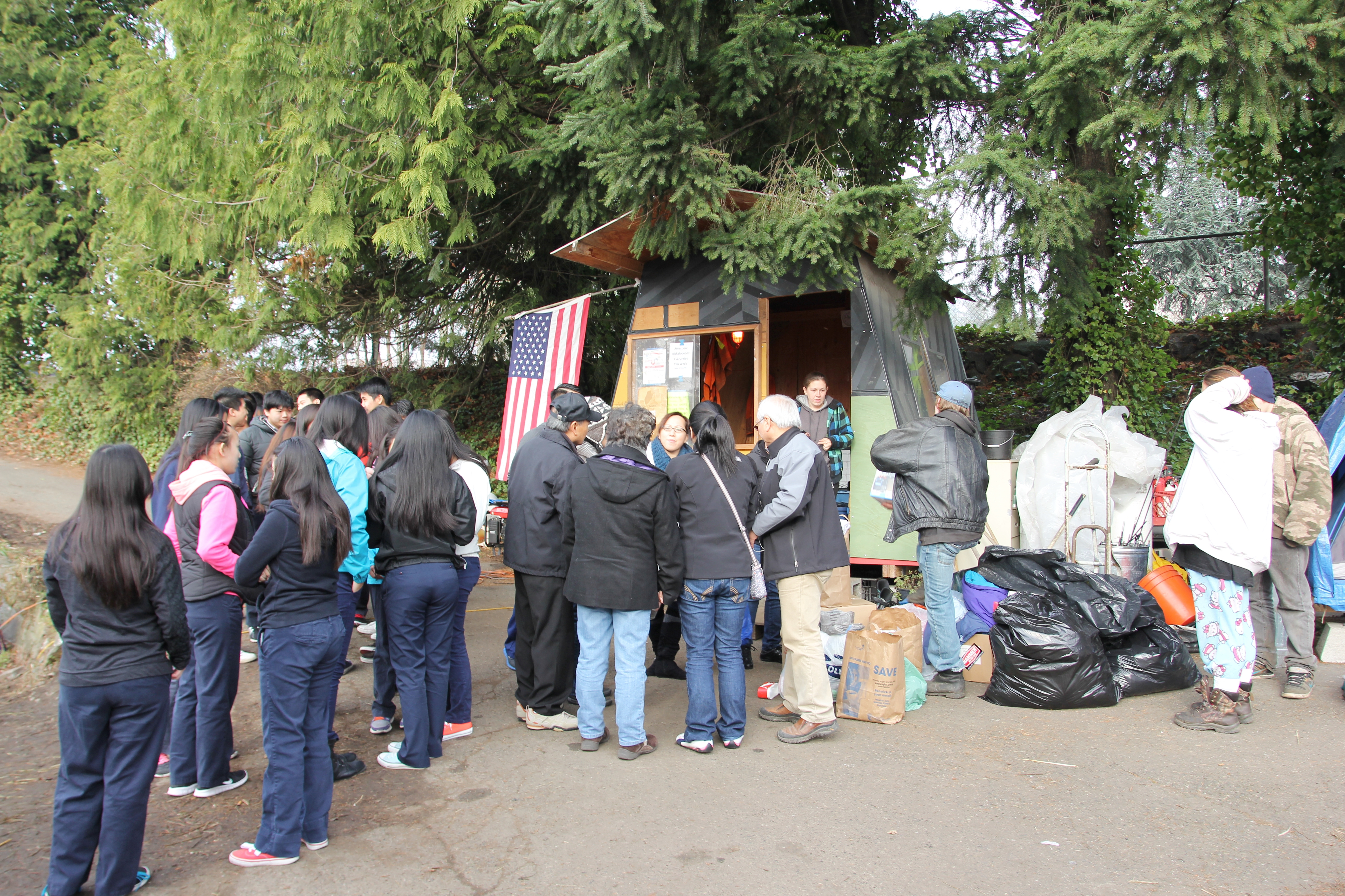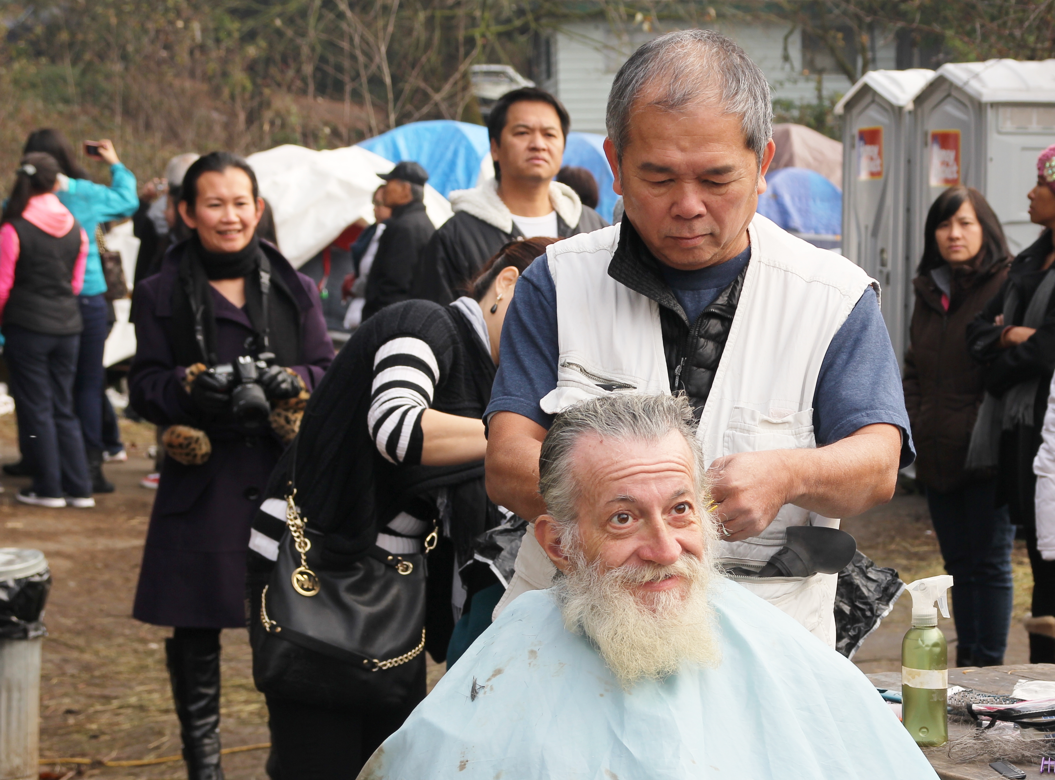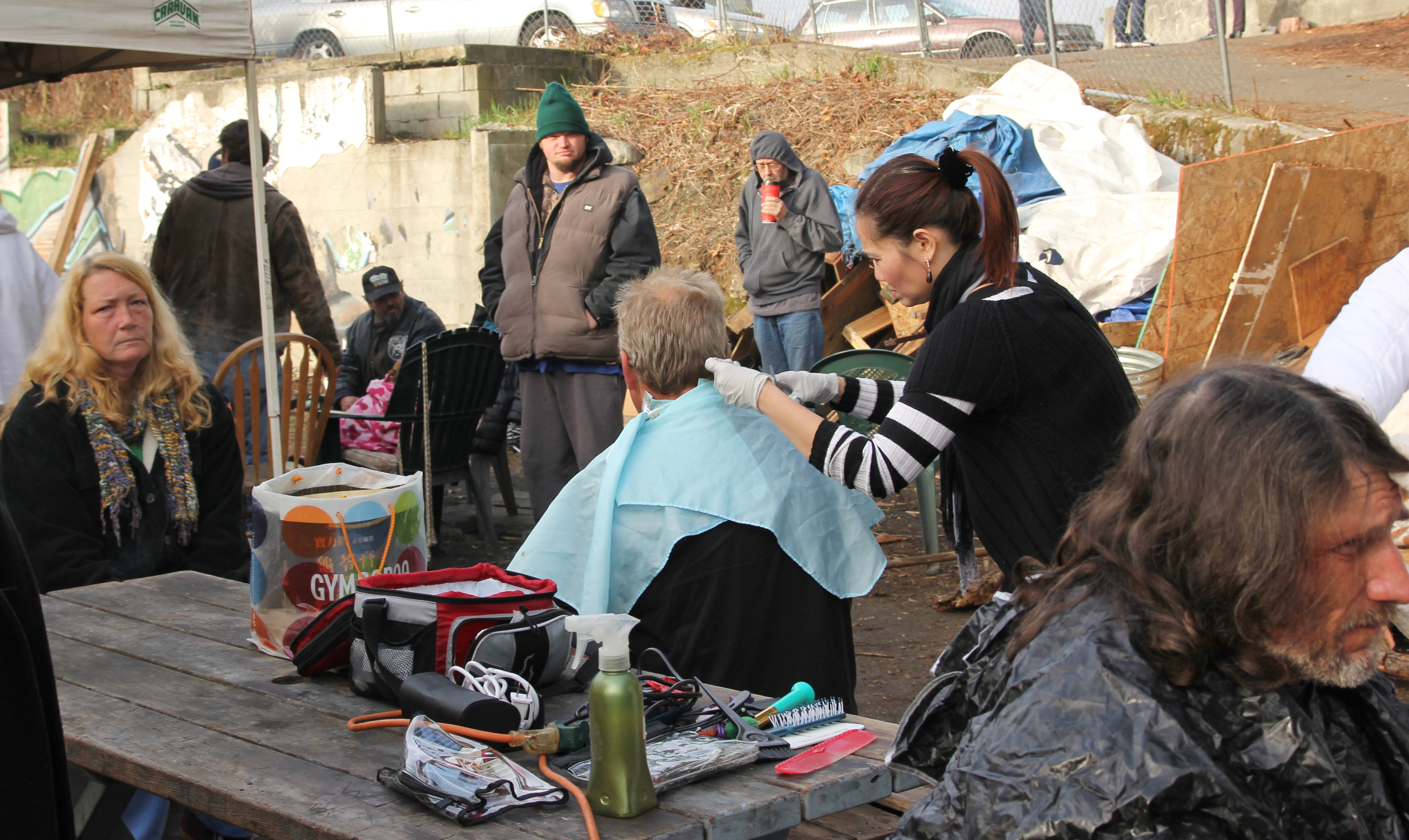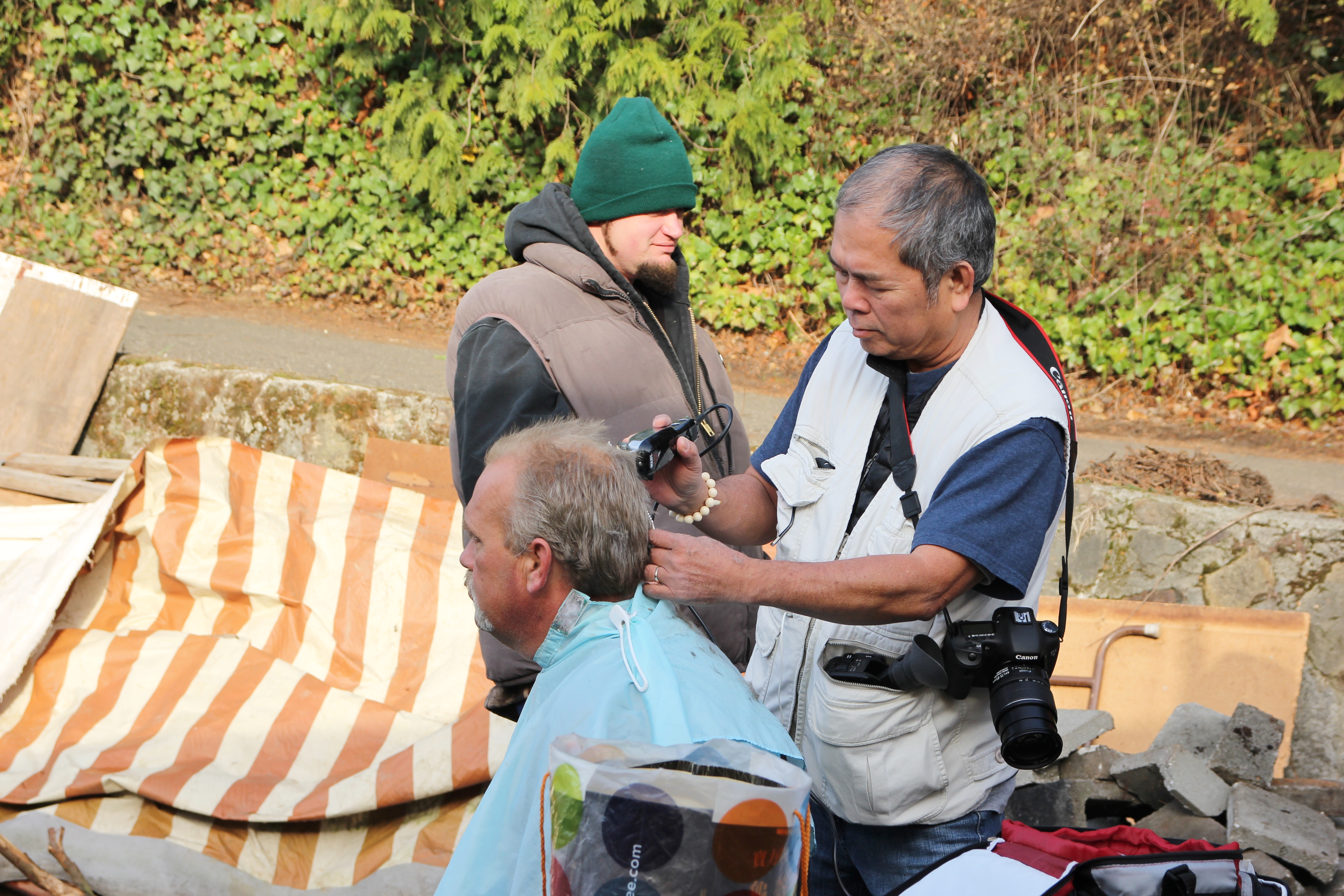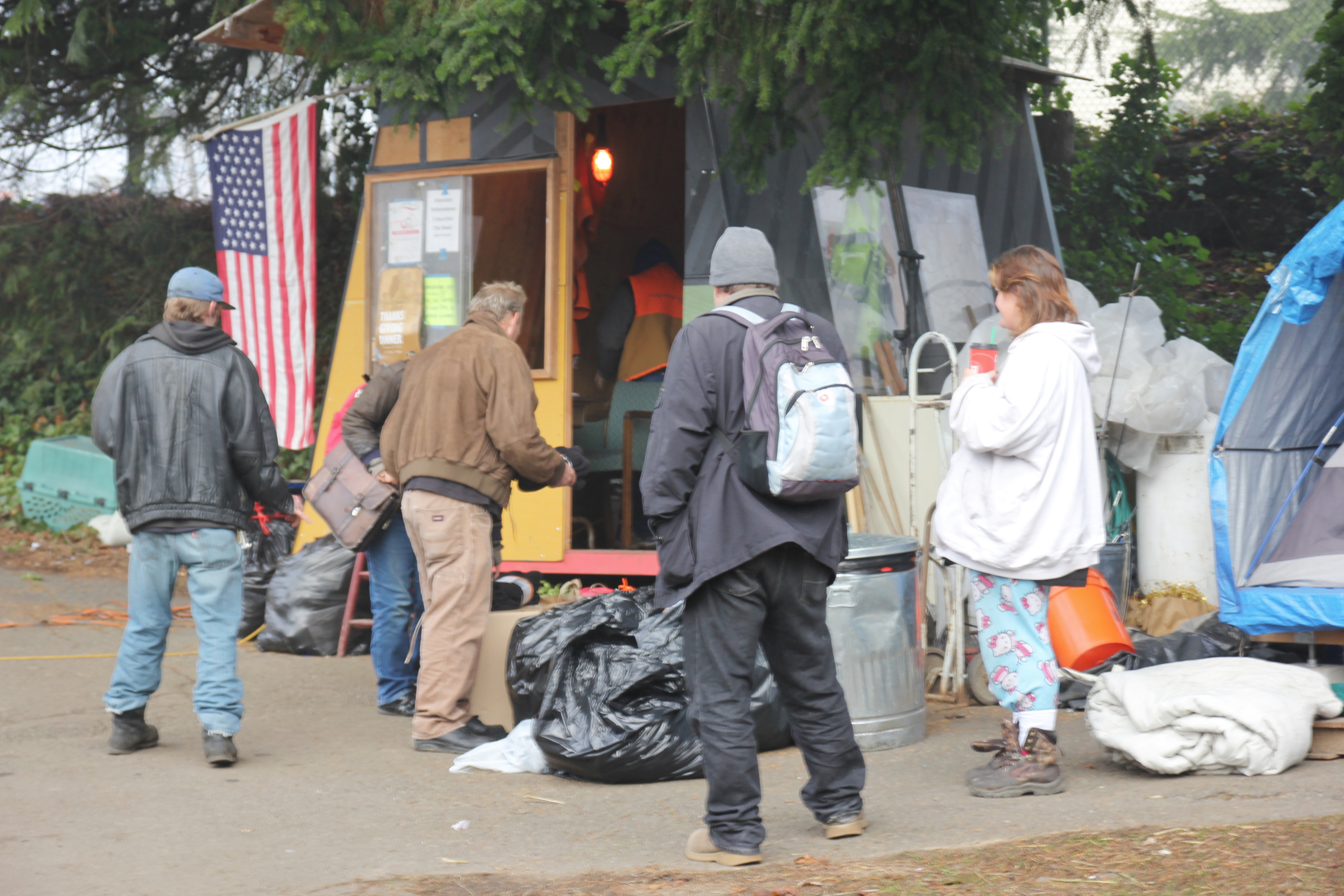 Hôm nay trời rất lạnh, sương mù che kín các túp lều thấp lè tè trên một miếng đất hẹp, chật chội, ẩm ướt. Nhìn vài tấm lều mình không thấy gì ngoài một tấm nệm và một tấm đắp, không điện đốm, không bếp nước. Tại nơi trung tâm có một thùng lớn họ đốt củi rồi thỉnh thoảng lại ngổi trên mấy cái ghế cũ kỷ bẩn thiểu để sưởi ấm. Trong đoàn có vài tình nguyện viên hớt tóc, tỉa râu cho người homeless. Món chã giò chay mà bà xã mình và người bạn hùn làm được chiếu có nhất, còn cơm thì có người thích người không. Thấy họ thật tội nghiệp, nếu mình ở trong hoàn cảnh nầy thì chết mất , không thể nào chịu được cái lạnh về đêm ở vùng Tây Bắc nầy. Bà con người Việt mình tới tham cũng đông, có người tới thăm cho biết , có người đem theo áo quần đố ấm, thức ăn khô…nhưng người nào cũng mặc hai ba lớp áo, trùm đầu mà còn run lập cập. Một anh bạn tâm sự ” Hồi tôi đi vượt biên, ở trong trại tỵ nạn sướng gấp trăm lần như thế nầy“. Mọi người đi thăm đều có chung cảm nghĩ: thay vì hoàn cảnh đó là của mình nếu còn sống ở Việt Nam. Bây giờ mình có cuộc sống tạm đủ và ấm cúng thì đất nước cưu mang chúng ta và tạo điều kiện cho con cháu chúng ta thành tài lại có những con người khốn khổ như thế nầy. Sáng nay có khoảng 30-40 cháu trong gia đình Phật tử Vạn Hạnh cùng tham dự. Chúng tôi muốn chỉ cho các cháu món ân tình mà cha mẹ các cháu đã mang, mong rằng các cháu đừng bao giờ quên và mỗi năm đến ngày Thanksgiving hảy cùng các cô chú bác, ông bà đi thăm các làng Homeless như thế nầy để chia xẽ nổi bất hạnh của những con người thiếu may mắn nầy.