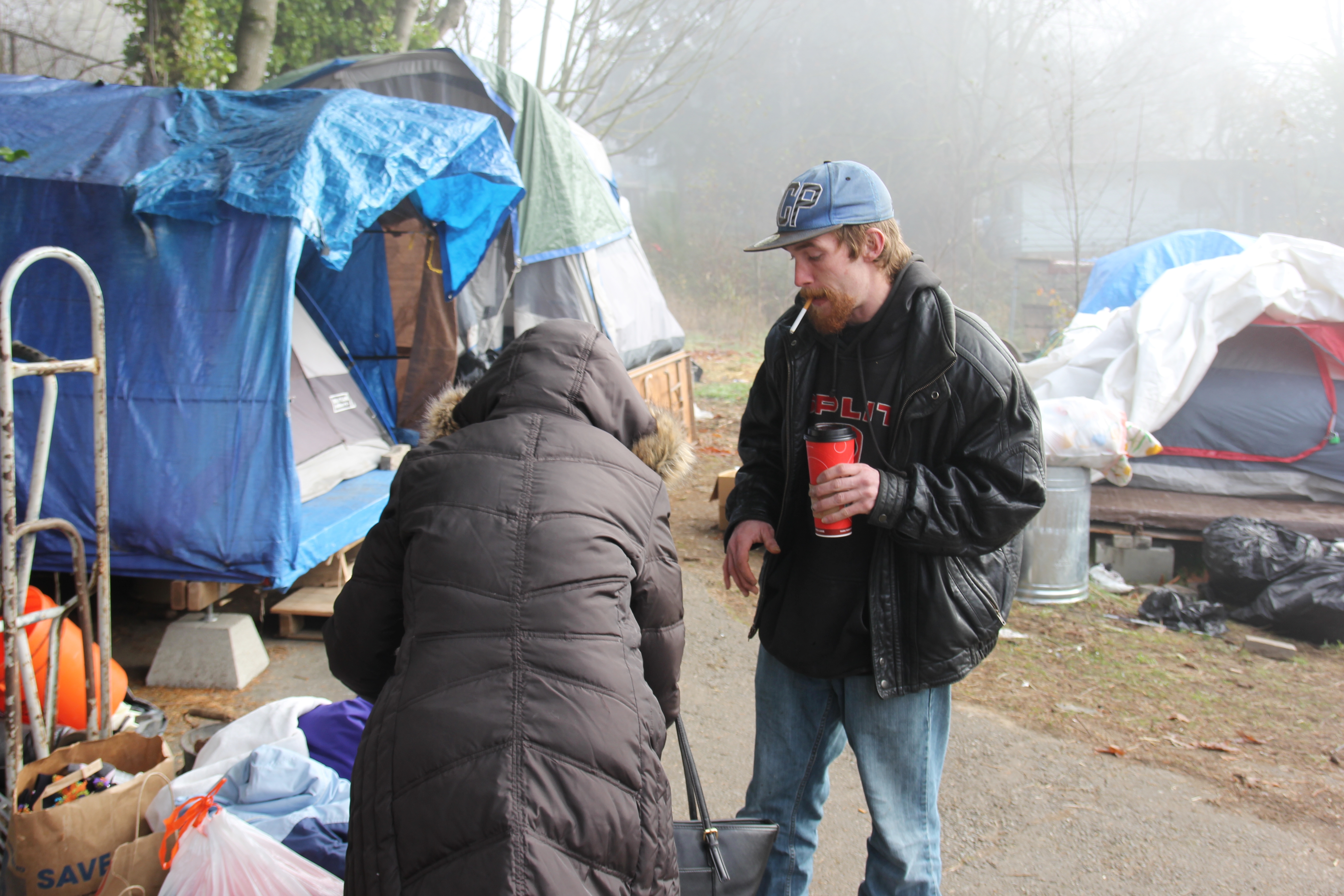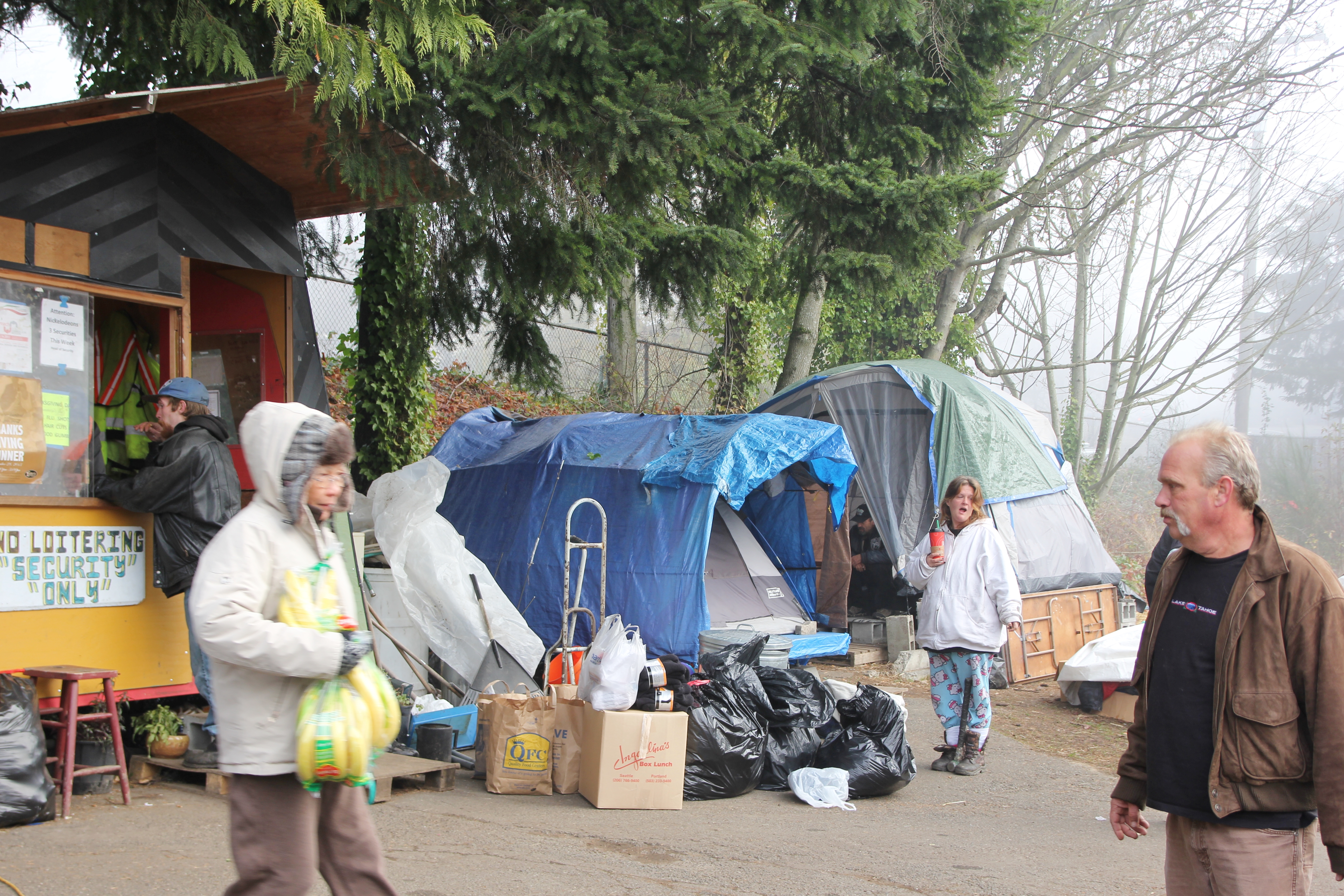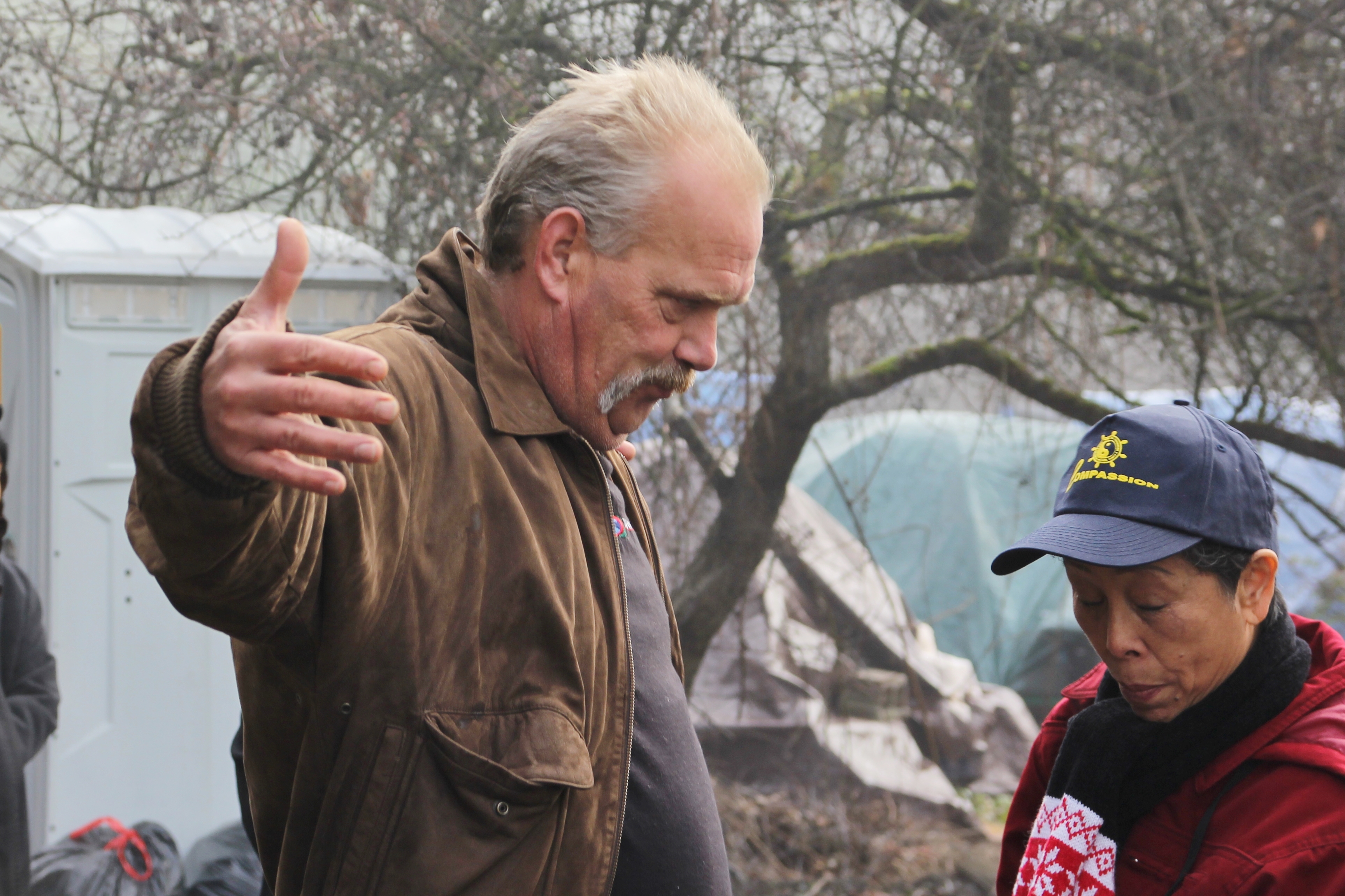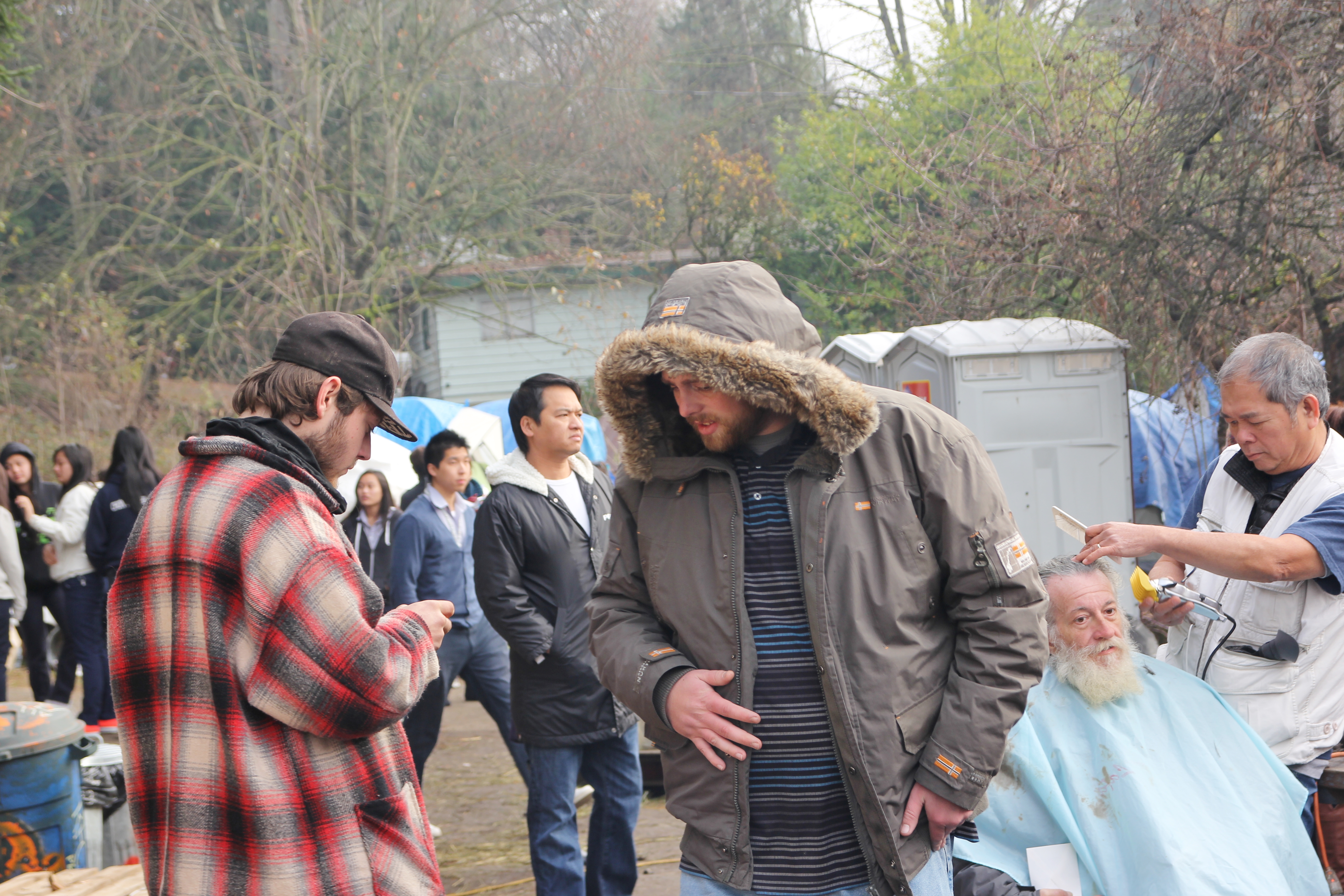 Hôm nay trời rất lạnh, sương mù che kín các túp lều thấp lè tè trên một miếng đất hẹp, chật chội, ẩm ướt. Nhìn vài tấm lều mình không thấy gì ngoài một tấm nệm và một tấm đắp, không điện đốm, không bếp nước. Tại nơi trung tâm có một thùng lớn họ đốt củi rồi thỉnh thoảng lại ngổi trên mấy cái ghế cũ kỷ bẩn thiểu để sưởi ấm. Trong đoàn có vài tình nguyện viên hớt tóc, tỉa râu cho người homeless. Món chã giò chay mà bà xã mình và người bạn hùn làm được chiếu có nhất, còn cơm thì có người thích người không. Thấy họ thật tội nghiệp, nếu mình ở trong hoàn cảnh nầy thì chết mất , không thể nào chịu được cái lạnh về đêm ở vùng Tây Bắc nầy. Bà con người Việt mình tới tham cũng đông, có người tới thăm cho biết , có người đem theo áo quần đố ấm, thức ăn khô…nhưng người nào cũng mặc hai ba lớp áo, trùm đầu mà còn run lập cập. Một anh bạn tâm sự ” Hồi tôi đi vượt biên, ở trong trại tỵ nạn sướng gấp trăm lần như thế nầy“. Mọi người đi thăm đều có chung cảm nghĩ: thay vì hoàn cảnh đó là của mình nếu còn sống ở Việt Nam. Bây giờ mình có cuộc sống tạm đủ và ấm cúng thì đất nước cưu mang chúng ta và tạo điều kiện cho con cháu chúng ta thành tài lại có những con người khốn khổ như thế nầy. Sáng nay có khoảng 30-40 cháu trong gia đình Phật tử Vạn Hạnh cùng tham dự. Chúng tôi muốn chỉ cho các cháu món ân tình mà cha mẹ các cháu đã mang, mong rằng các cháu đừng bao giờ quên và mỗi năm đến ngày Thanksgiving hảy cùng các cô chú bác, ông bà đi thăm các làng Homeless như thế nầy để chia xẽ nổi bất hạnh của những con người thiếu may mắn nầy.
