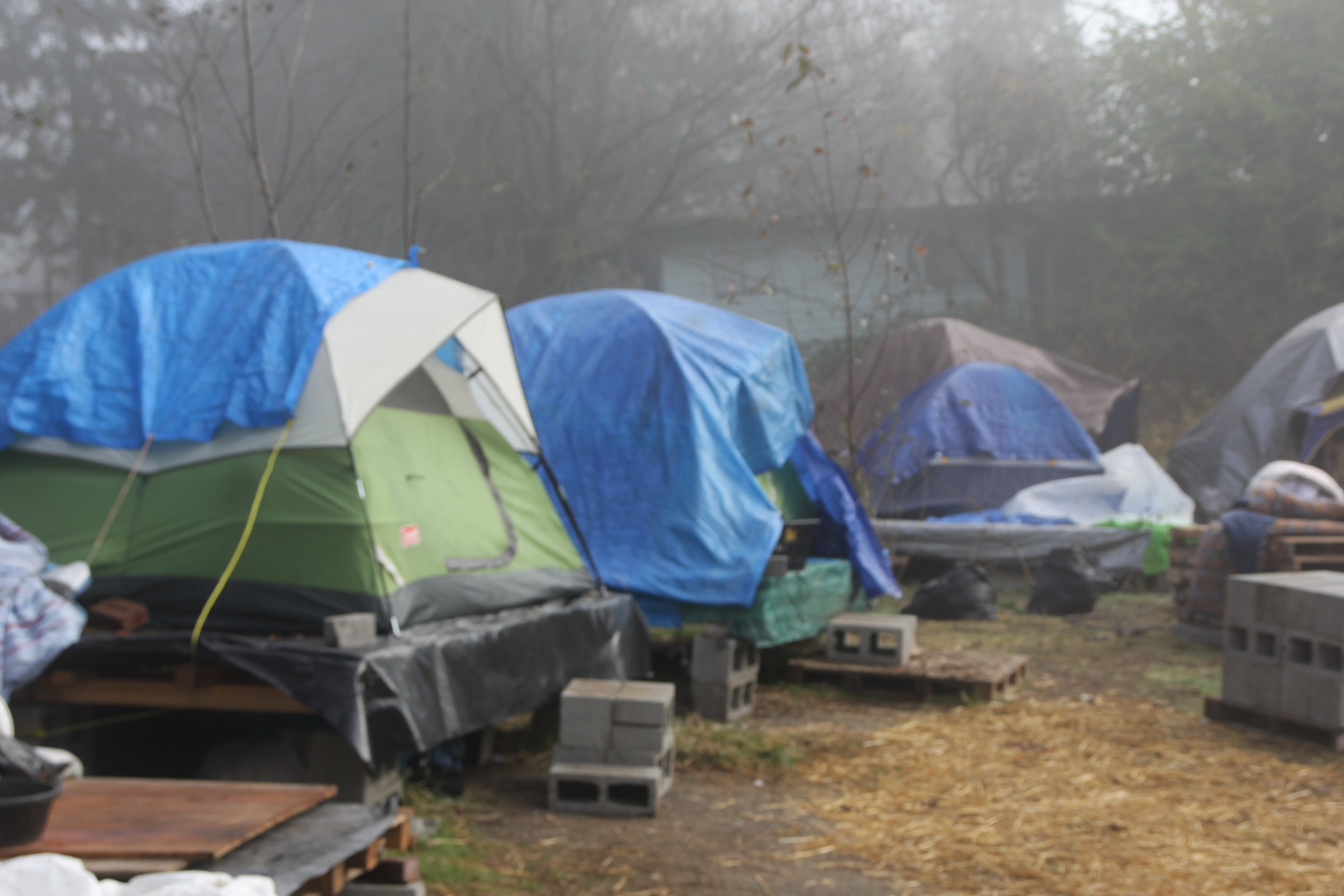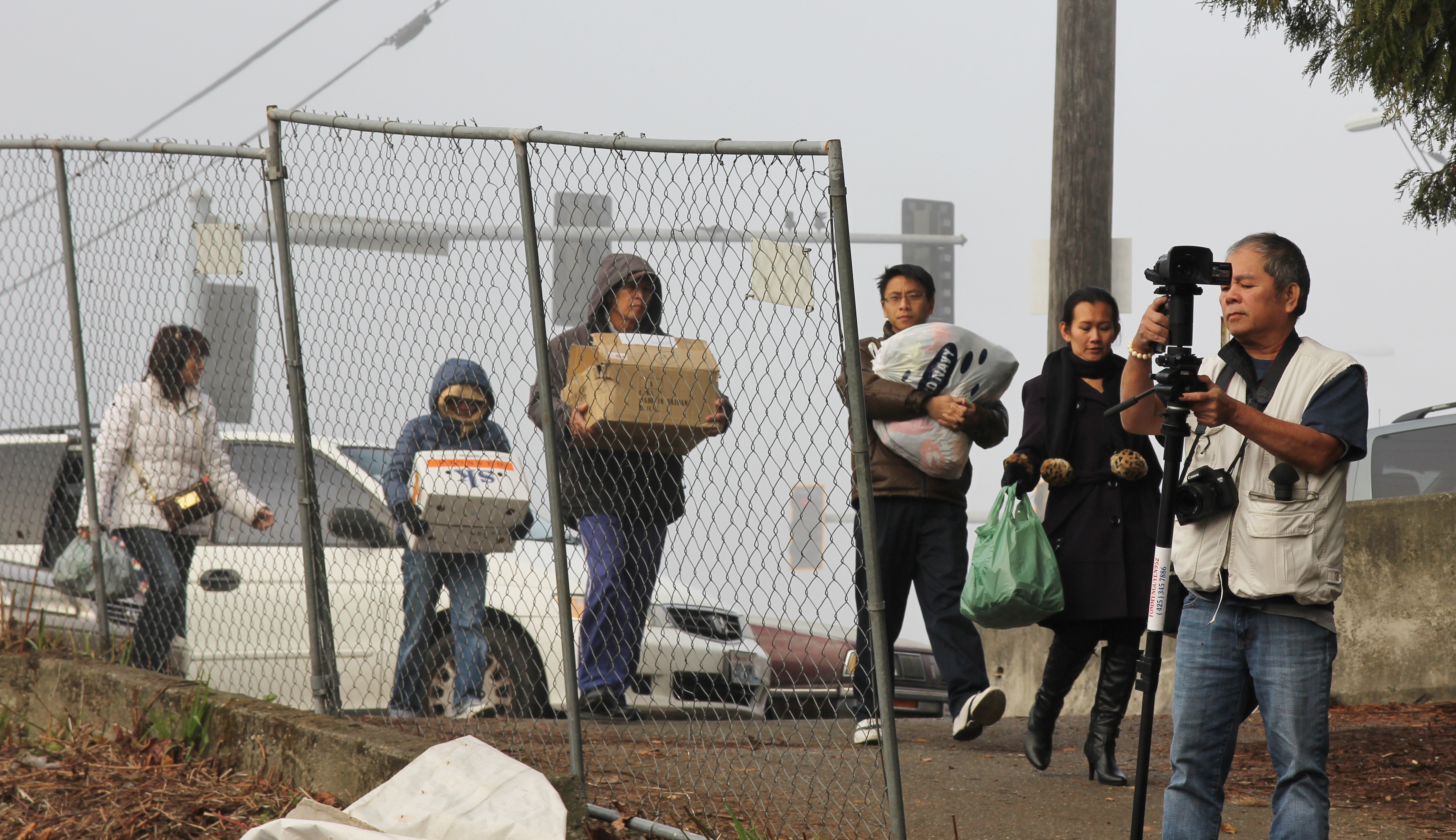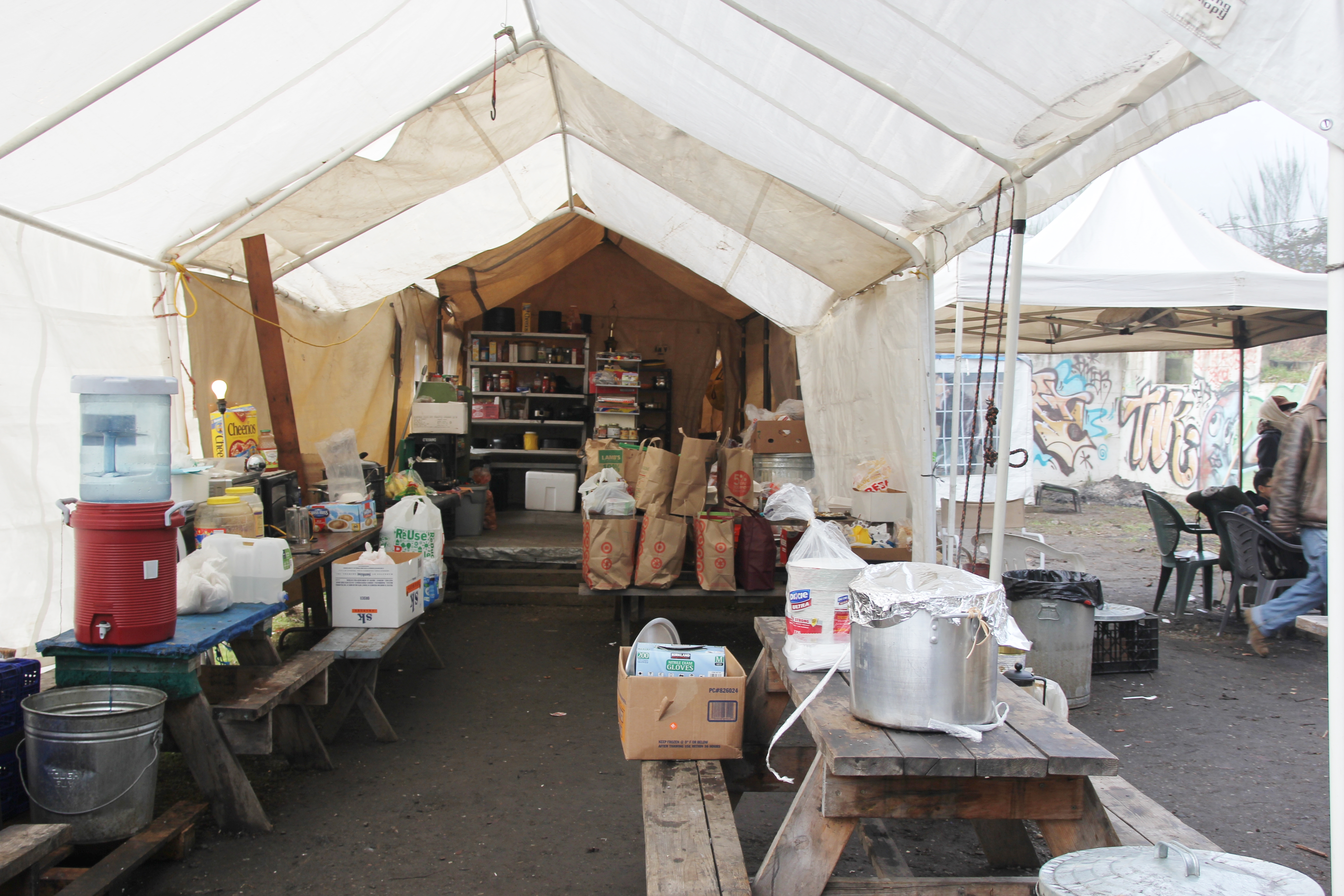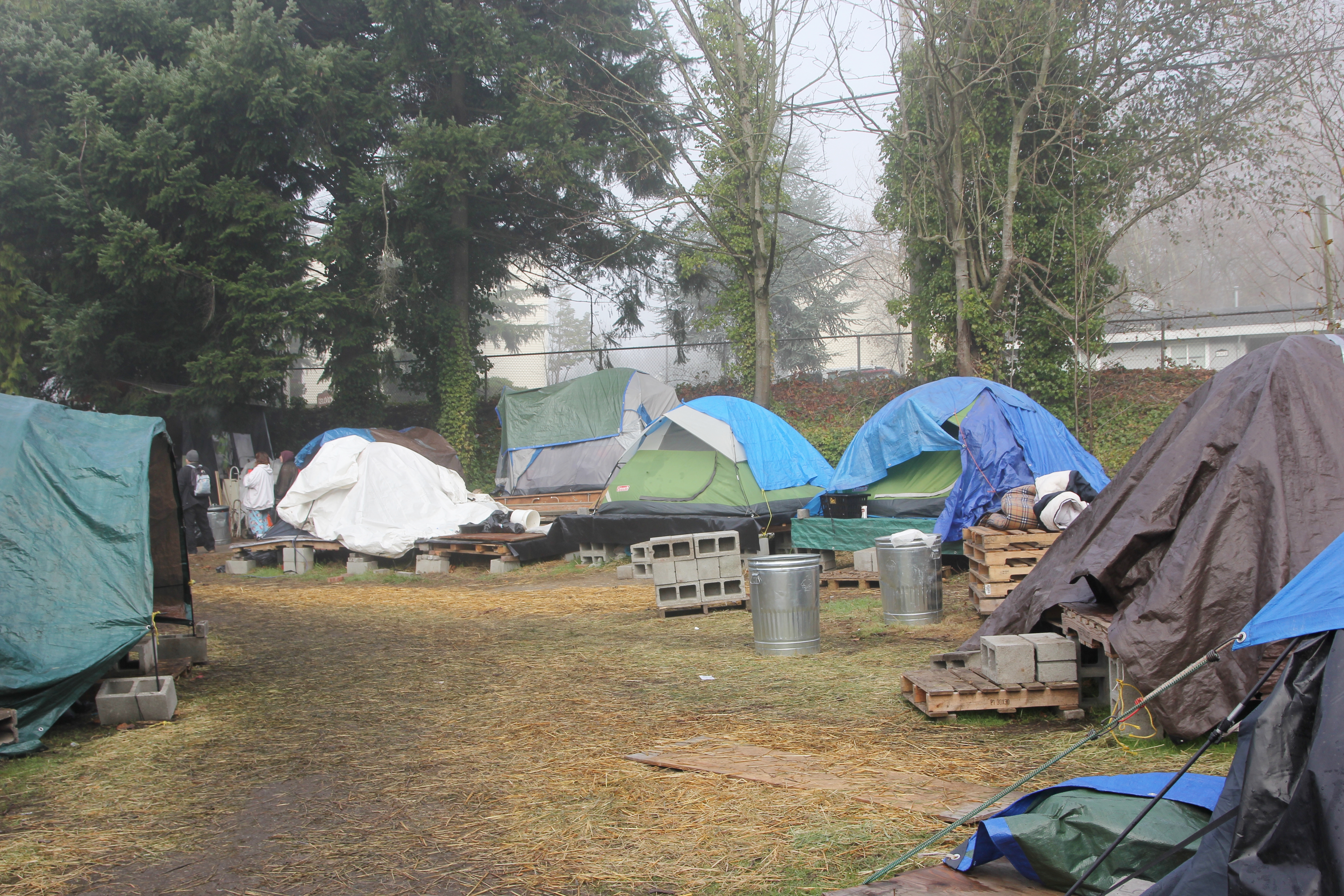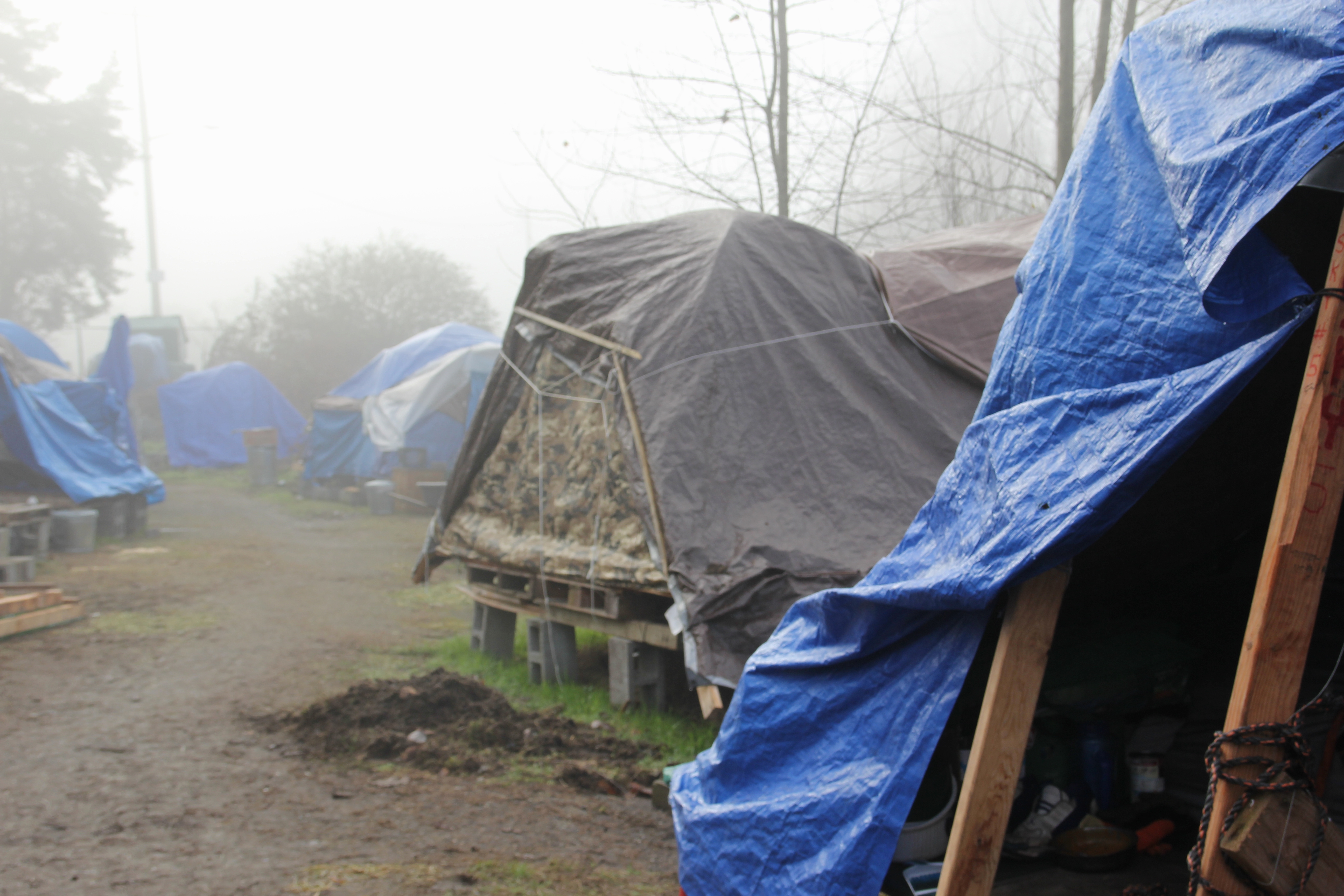 Hôm nay trời rất lạnh, sương mù che kín các túp lều thấp lè tè trên một miếng đất hẹp, chật chội, ẩm ướt. Nhìn vài tấm lều mình không thấy gì ngoài một tấm nệm và một tấm đắp, không điện đốm, không bếp nước. Tại nơi trung tâm có một thùng lớn họ đốt củi rồi thỉnh thoảng lại ngổi trên mấy cái ghế cũ kỷ bẩn thiểu để sưởi ấm. Trong đoàn có vài tình nguyện viên hớt tóc, tỉa râu cho người homeless. Món chã giò chay mà bà xã mình và người bạn hùn làm được chiếu có nhất, còn cơm thì có người thích người không. Thấy họ thật tội nghiệp, nếu mình ở trong hoàn cảnh nầy thì chết mất , không thể nào chịu được cái lạnh về đêm ở vùng Tây Bắc nầy. Bà con người Việt mình tới tham cũng đông, có người tới thăm cho biết , có người đem theo áo quần đố ấm, thức ăn khô…nhưng người nào cũng mặc hai ba lớp áo, trùm đầu mà còn run lập cập. Một anh bạn tâm sự ” Hồi tôi đi vượt biên, ở trong trại tỵ nạn sướng gấp trăm lần như thế nầy“. Mọi người đi thăm đều có chung cảm nghĩ: thay vì hoàn cảnh đó là của mình nếu còn sống ở Việt Nam. Bây giờ mình có cuộc sống tạm đủ và ấm cúng thì đất nước cưu mang chúng ta và tạo điều kiện cho con cháu chúng ta thành tài lại có những con người khốn khổ như thế nầy. Sáng nay có khoảng 30-40 cháu trong gia đình Phật tử Vạn Hạnh cùng tham dự. Chúng tôi muốn chỉ cho các cháu món ân tình mà cha mẹ các cháu đã mang, mong rằng các cháu đừng bao giờ quên và mỗi năm đến ngày Thanksgiving hảy cùng các cô chú bác, ông bà đi thăm các làng Homeless như thế nầy để chia xẽ nổi bất hạnh của những con người thiếu may mắn nầy.