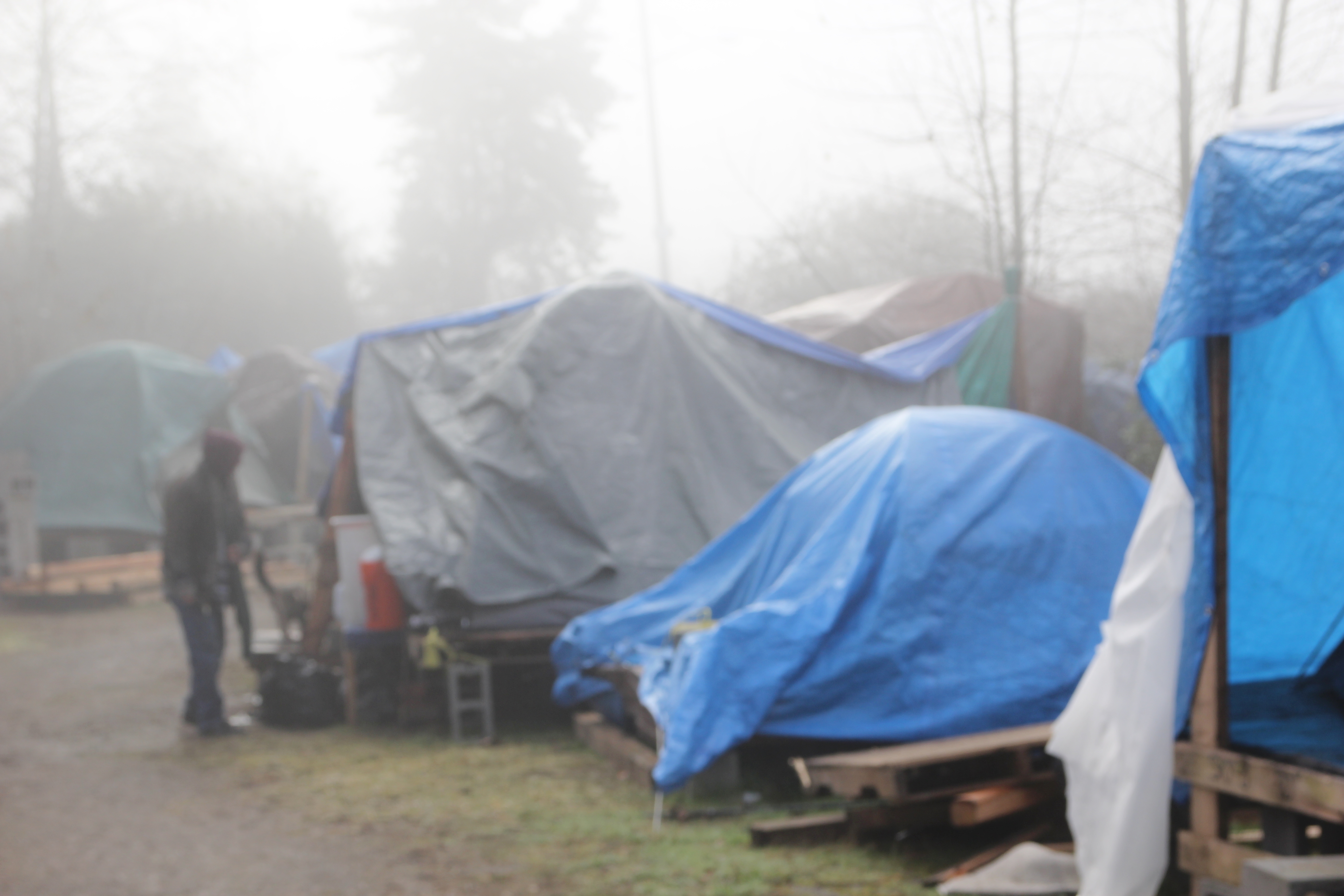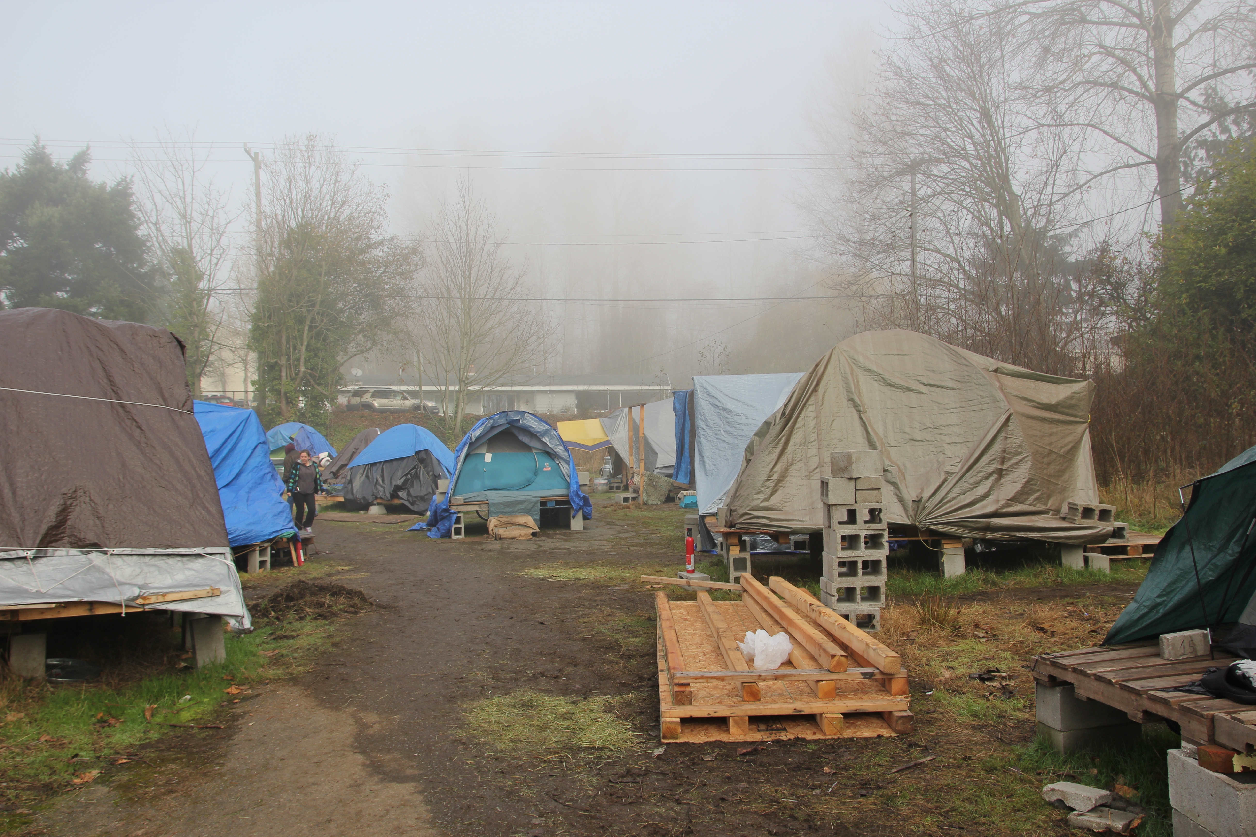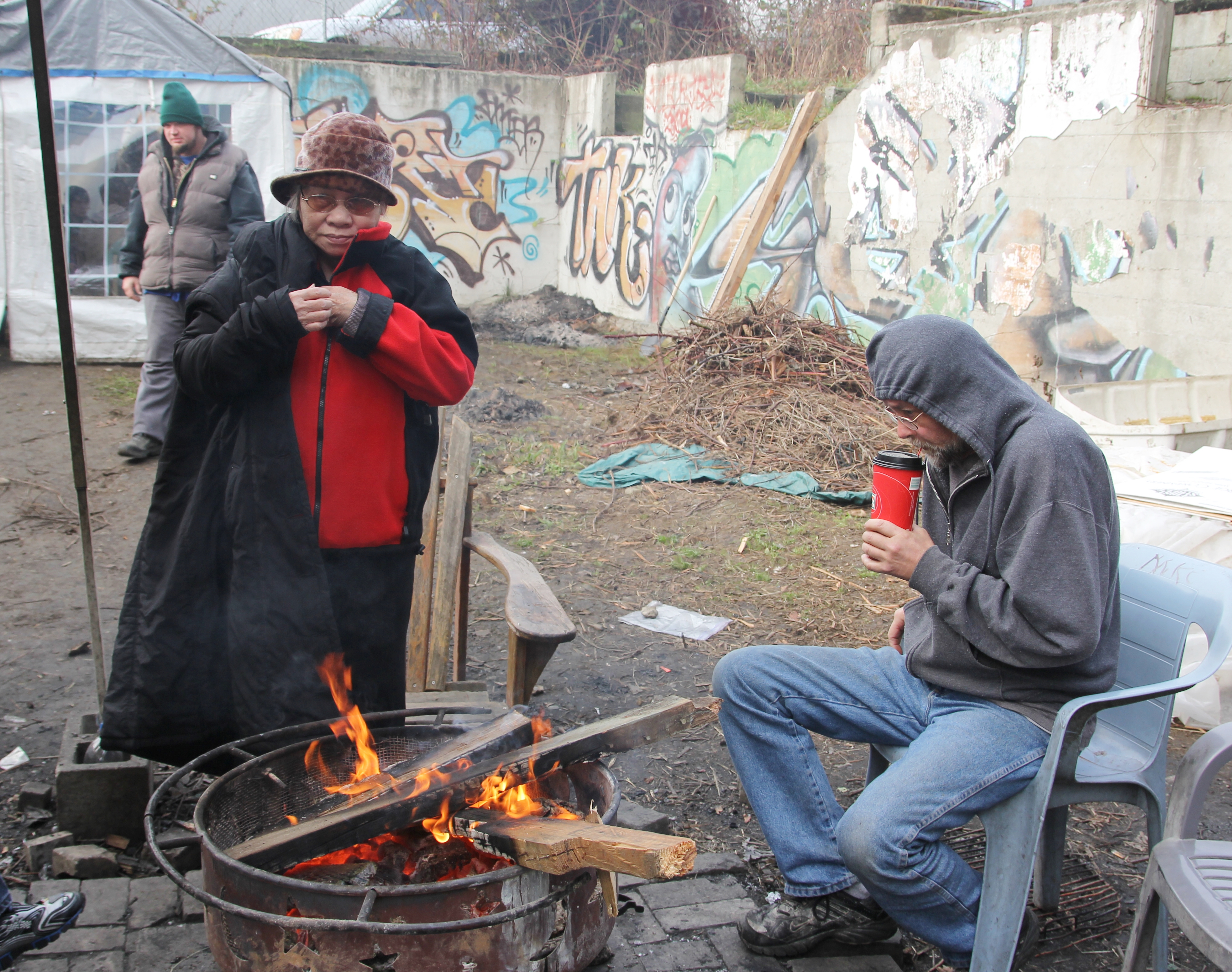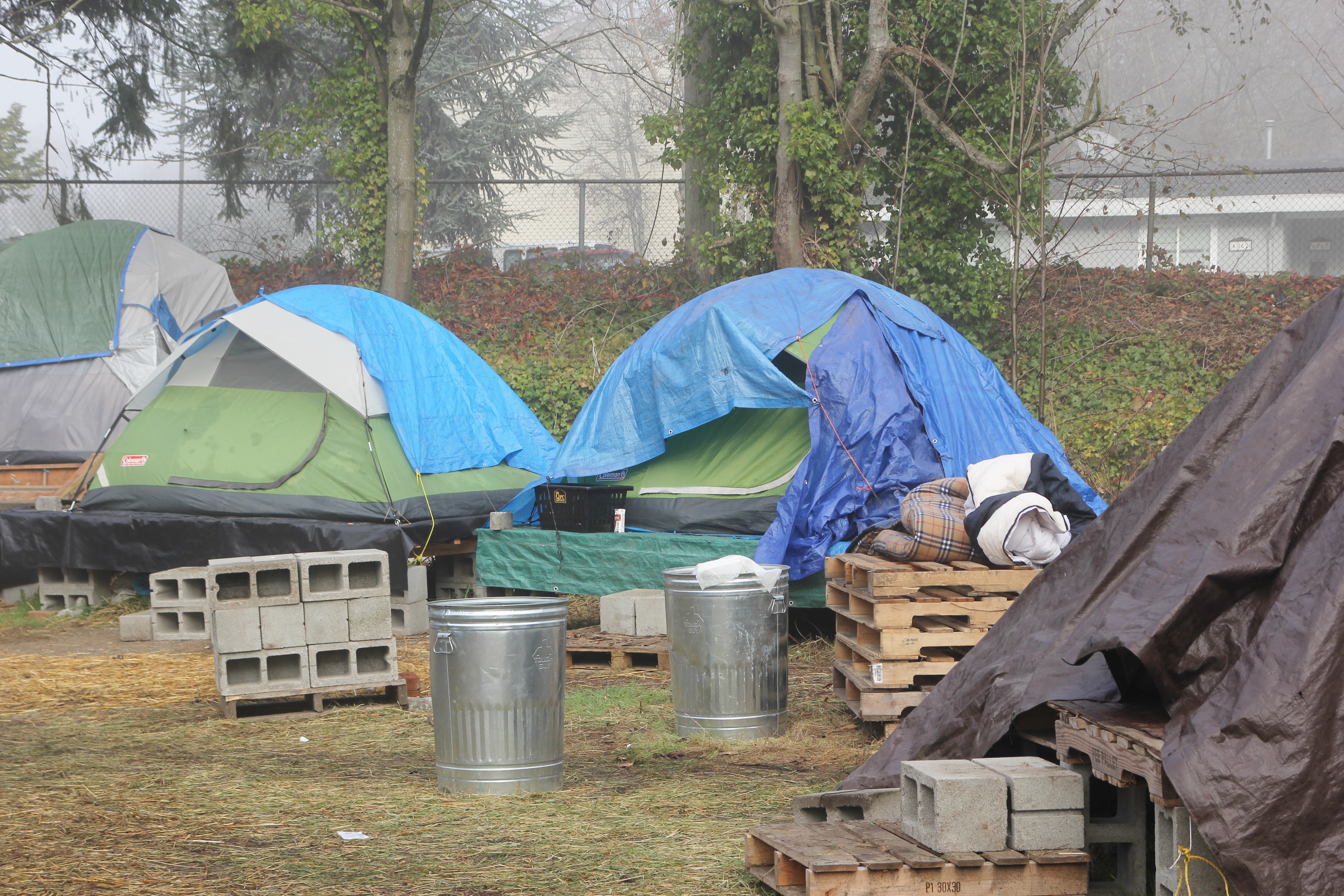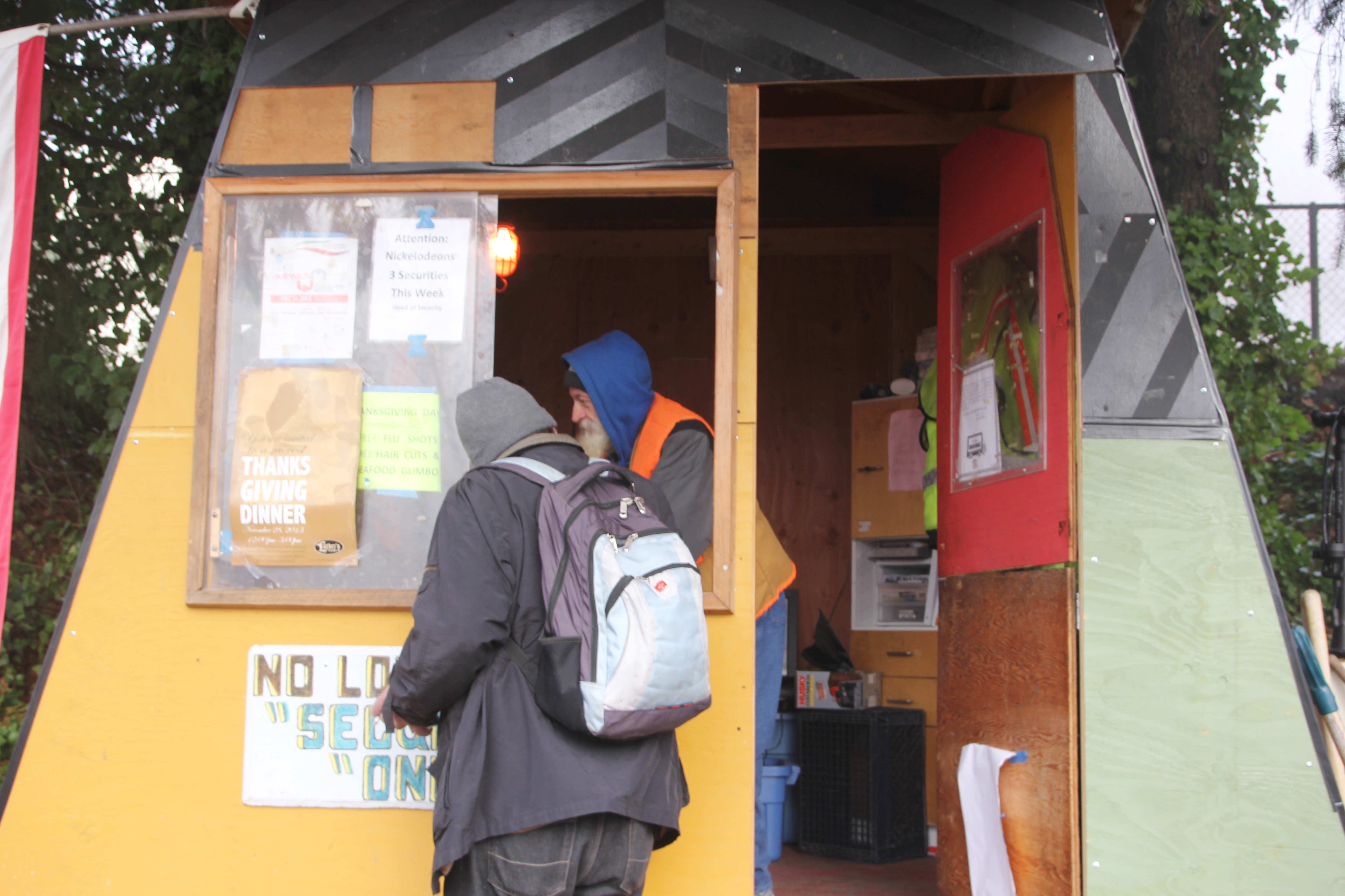 Hôm nay trời rất lạnh, sương mù che kín các túp lều thấp lè tè trên một miếng đất hẹp, chật chội, ẩm ướt. Nhìn vài tấm lều mình không thấy gì ngoài một tấm nệm và một tấm đắp, không điện đốm, không bếp nước. Tại nơi trung tâm có một thùng lớn họ đốt củi rồi thỉnh thoảng lại ngổi trên mấy cái ghế cũ kỷ bẩn thiểu để sưởi ấm. Trong đoàn có vài tình nguyện viên hớt tóc, tỉa râu cho người homeless. Món chã giò chay mà bà xã mình và người bạn hùn làm được chiếu có nhất, còn cơm thì có người thích người không. Thấy họ thật tội nghiệp, nếu mình ở trong hoàn cảnh nầy thì chết mất , không thể nào chịu được cái lạnh về đêm ở vùng Tây Bắc nầy. Bà con người Việt mình tới tham cũng đông, có người tới thăm cho biết , có người đem theo áo quần đố ấm, thức ăn khô…nhưng người nào cũng mặc hai ba lớp áo, trùm đầu mà còn run lập cập. Một anh bạn tâm sự ” Hồi tôi đi vượt biên, ở trong trại tỵ nạn sướng gấp trăm lần như thế nầy“. Mọi người đi thăm đều có chung cảm nghĩ: thay vì hoàn cảnh đó là của mình nếu còn sống ở Việt Nam. Bây giờ mình có cuộc sống tạm đủ và ấm cúng thì đất nước cưu mang chúng ta và tạo điều kiện cho con cháu chúng ta thành tài lại có những con người khốn khổ như thế nầy. Sáng nay có khoảng 30-40 cháu trong gia đình Phật tử Vạn Hạnh cùng tham dự. Chúng tôi muốn chỉ cho các cháu món ân tình mà cha mẹ các cháu đã mang, mong rằng các cháu đừng bao giờ quên và mỗi năm đến ngày Thanksgiving hảy cùng các cô chú bác, ông bà đi thăm các làng Homeless như thế nầy để chia xẽ nổi bất hạnh của những con người thiếu may mắn nầy.