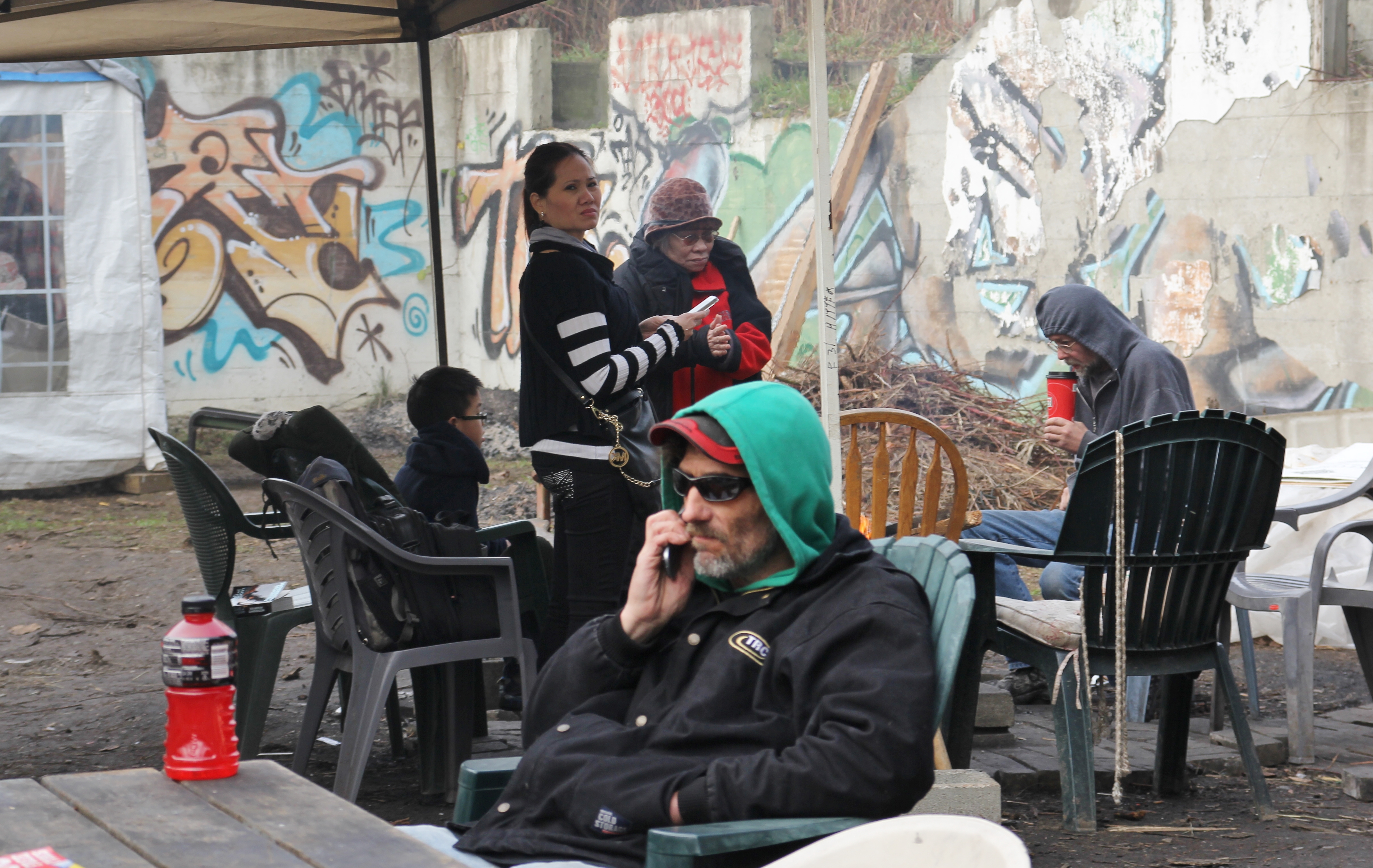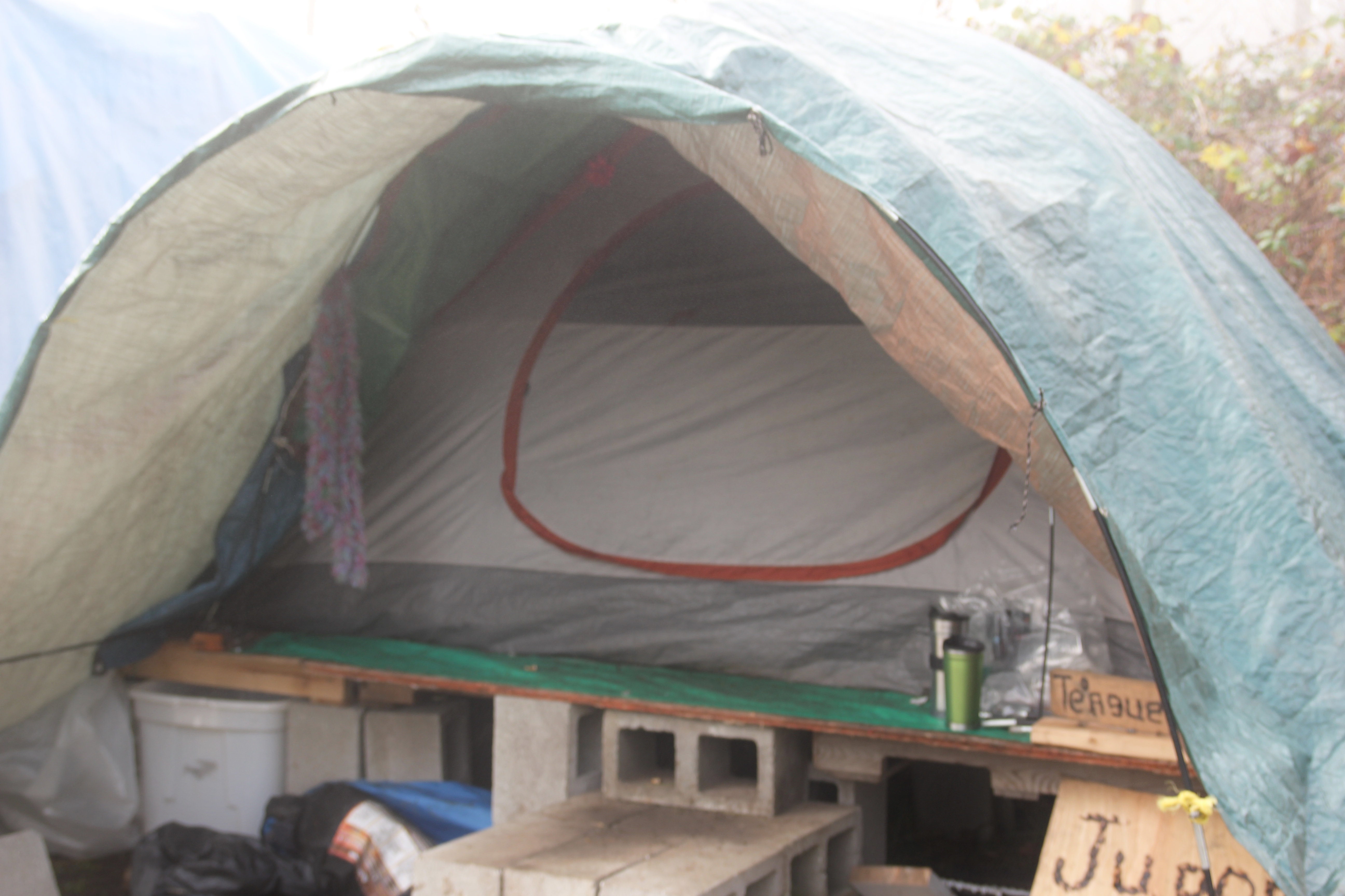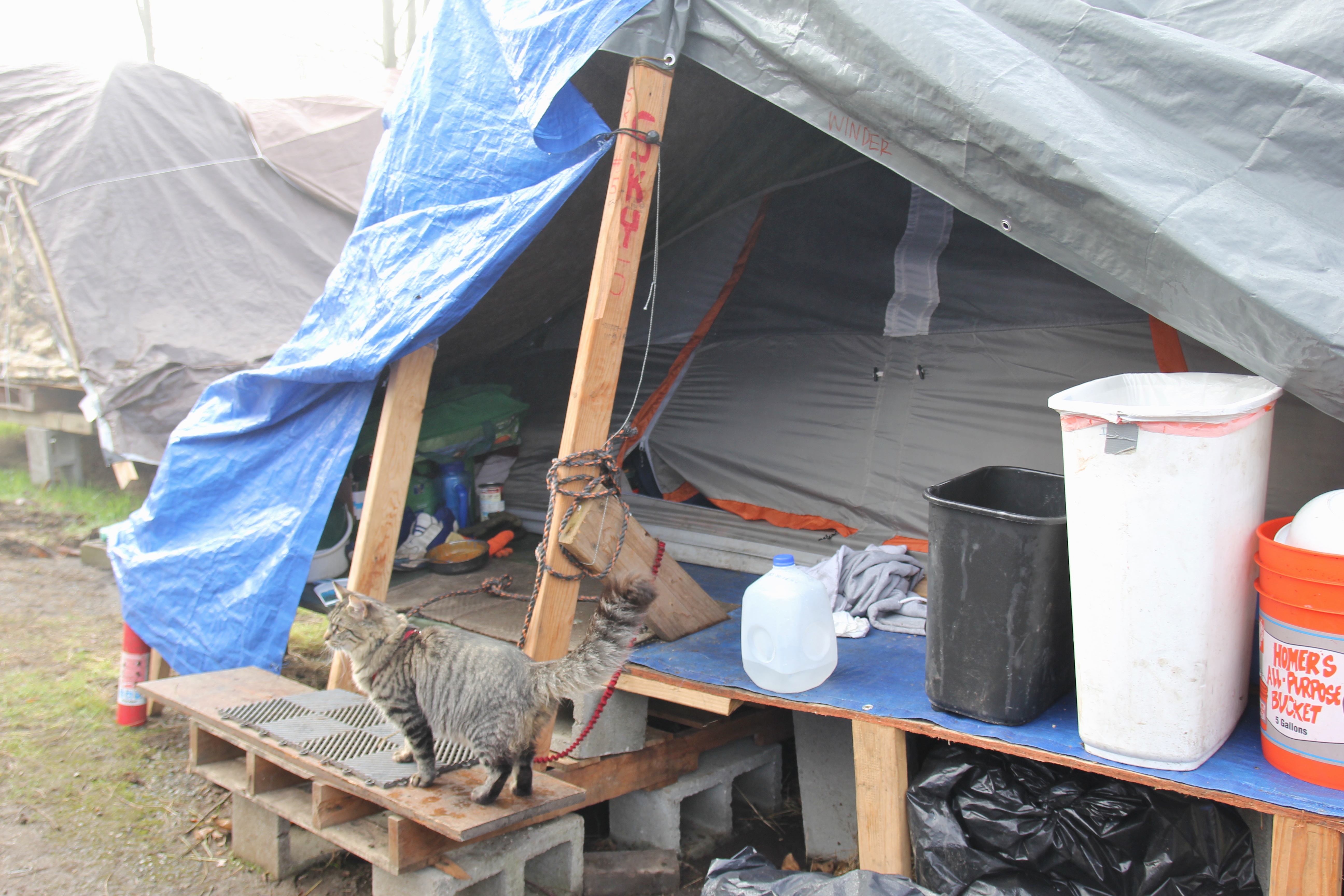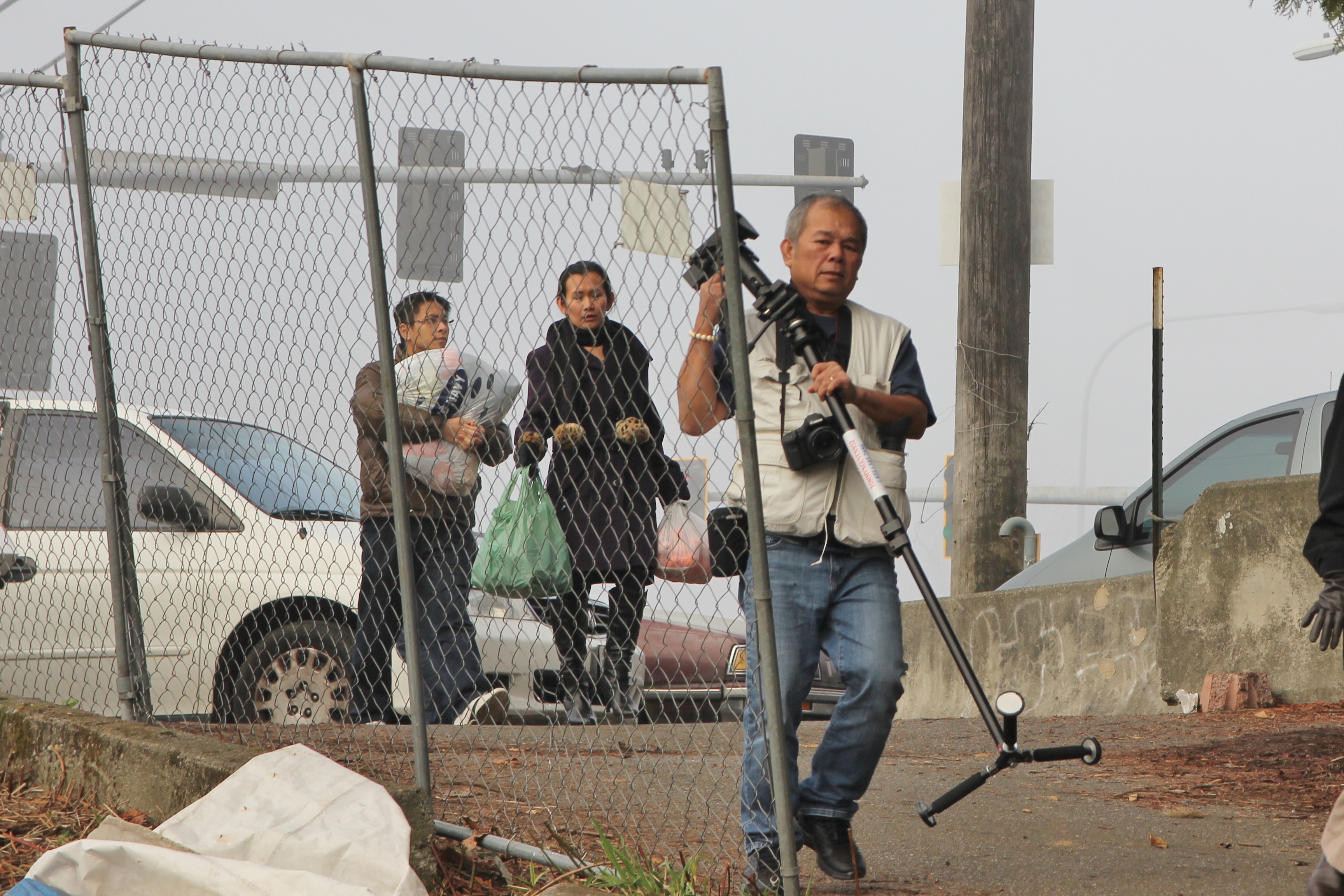 Hôm nay trời rất lạnh, sương mù che kín các túp lều thấp lè tè trên một miếng đất hẹp, chật chội, ẩm ướt. Nhìn vài tấm lều mình không thấy gì ngoài một tấm nệm và một tấm đắp, không điện đốm, không bếp nước. Tại nơi trung tâm có một thùng lớn họ đốt củi rồi thỉnh thoảng lại ngổi trên mấy cái ghế cũ kỷ bẩn thiểu để sưởi ấm. Trong đoàn có vài tình nguyện viên hớt tóc, tỉa râu cho người homeless. Món chã giò chay mà bà xã mình và người bạn hùn làm được chiếu có nhất, còn cơm thì có người thích người không. Thấy họ thật tội nghiệp, nếu mình ở trong hoàn cảnh nầy thì chết mất , không thể nào chịu được cái lạnh về đêm ở vùng Tây Bắc nầy. Bà con người Việt mình tới tham cũng đông, có người tới thăm cho biết , có người đem theo áo quần đố ấm, thức ăn khô…nhưng người nào cũng mặc hai ba lớp áo, trùm đầu mà còn run lập cập. Một anh bạn tâm sự ” Hồi tôi đi vượt biên, ở trong trại tỵ nạn sướng gấp trăm lần như thế nầy“. Mọi người đi thăm đều có chung cảm nghĩ: thay vì hoàn cảnh đó là của mình nếu còn sống ở Việt Nam. Bây giờ mình có cuộc sống tạm đủ và ấm cúng thì đất nước cưu mang chúng ta và tạo điều kiện cho con cháu chúng ta thành tài lại có những con người khốn khổ như thế nầy. Sáng nay có khoảng 30-40 cháu trong gia đình Phật tử Vạn Hạnh cùng tham dự. Chúng tôi muốn chỉ cho các cháu món ân tình mà cha mẹ các cháu đã mang, mong rằng các cháu đừng bao giờ quên và mỗi năm đến ngày Thanksgiving hảy cùng các cô chú bác, ông bà đi thăm các làng Homeless như thế nầy để chia xẽ nổi bất hạnh của những con người thiếu may mắn nầy.