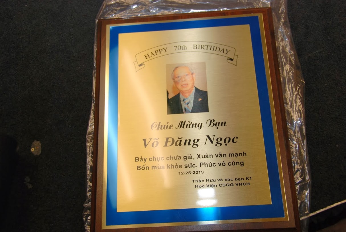 Bạn Thieu Vo có gởi đến CNN một số hình ảnh mừng sinh nhật thứ 70 của K1 VỎ ĐĂNG NGỌC (30.12.1944 – 30.12.2013). Buổi tiệc mừng được tổ chức vào ngày Christmas nên không khí rất đầm ấm và tràn niềm vui hạnh phúc. Một số anh chị em K1 đến tham dự, đặc biệt K1 Phan Tấn Ngưu có tặng cho K1 Vỏ Đăng Ngọc một plaque rất đẹp. Dưới đây là một số hình ảnh đẹp mà phó nhòm ThieuVo ghi được.