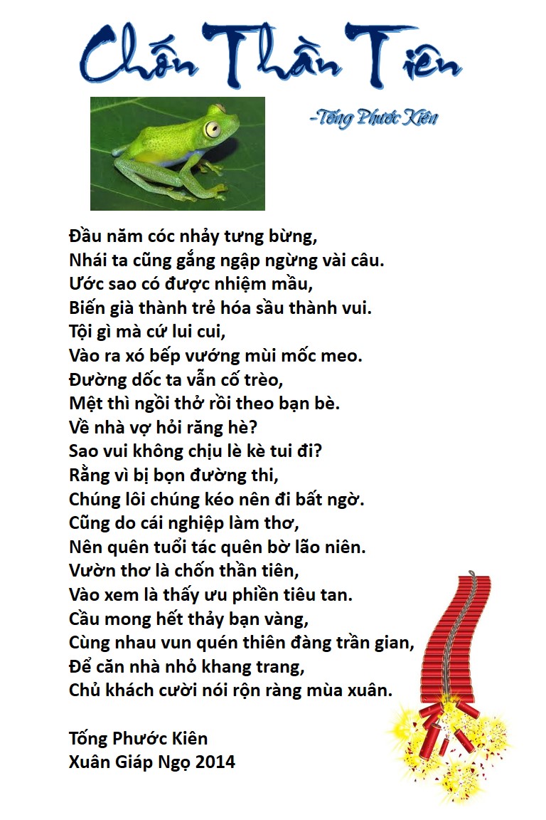 Hương vị mùa xuân chưa tới mà đàn cóc đã rời hang ổ nhảy loạn xạ khiến mấy cóc mới như cóc núi, cóc chầu rìa…cũng nhảy theo ì oạp, đúng là vui nhu tết. Thấy vui quá nên nhái tôi cũng ngoi lên oạp oạp vài câu để vui ké.