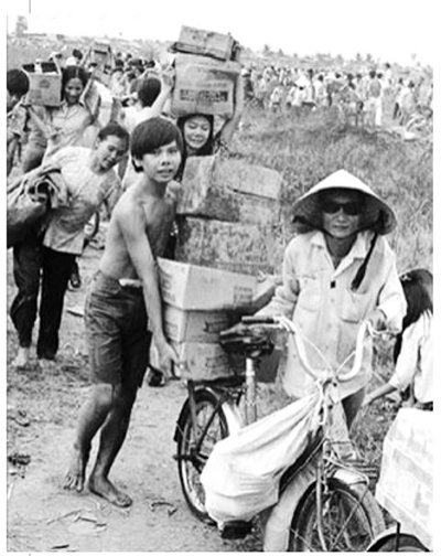 Tôi nằm im một ngày, rồi đứng dậy thay áo quần tươm tất đàng hoàng rồi nắm tay hai đứa con đi. Mẹ con tôi lang thang từ con phố này qua con phố khác, chân mỏi rã rời, bụng đói đến nhẹ tênh … Bỗng như một phép lạ, tôi nhìn thấy người bạn năm xưa Quinhon . Tôi mừng quýnh quán như gặp Cha gặp Mẹ. Bởi đã mấy tháng qua tôi sống với những người xa lạ chung quanh – hông dám tiếp xúc, không dám đến gần. Chỉ toàn xa lạ. Chúng tôi ôm nhau mừng rỡ với nước mắt vì chúng tôi là những người chạy giặc từ Quinhon vô Saigon tưởng không còn để gặp hôm nay sau một tháng lăn xả, tranh đấu tận cùng sức lực với hoảng loạn trộm cướp, hiểm nguy của buổi giao thời. Chúng tôi sống.