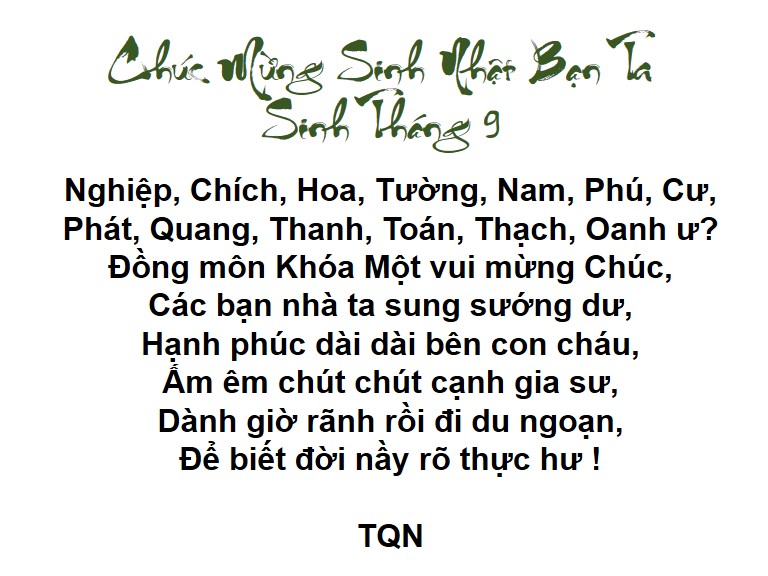 Trong tháng Chín năm nay, Căn Nhà Nhỏ thân mến gởi đến các bạn có tên sau đây vui hưởng ngày sinh nhật thật đầm ấm bên cạnh những người thân và bè bạn.