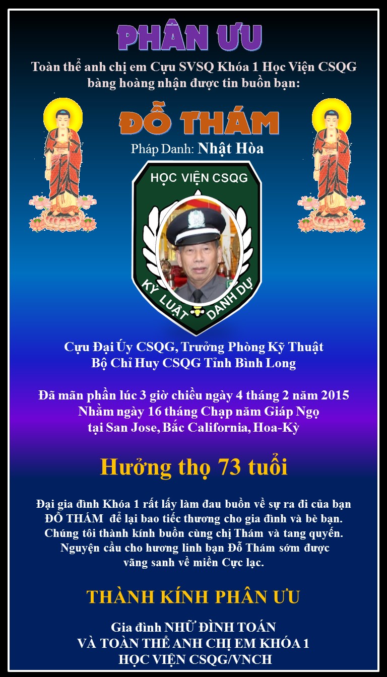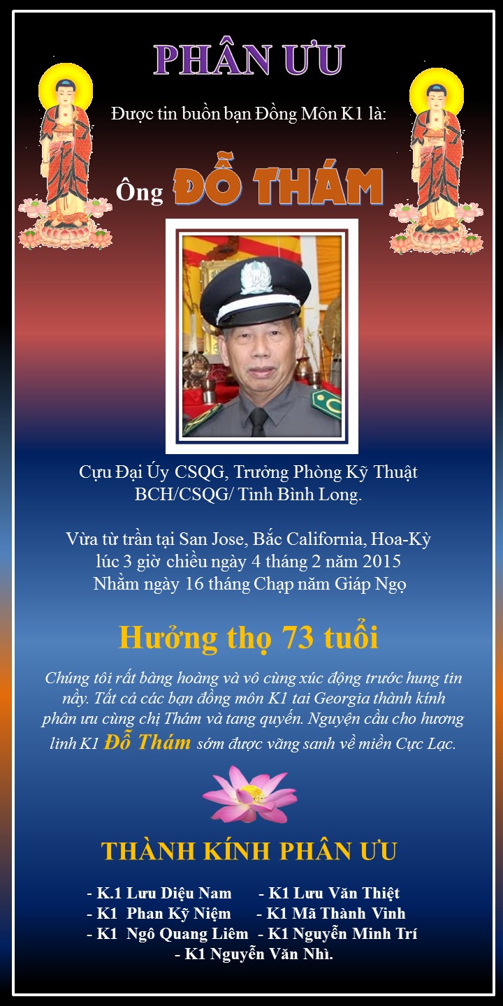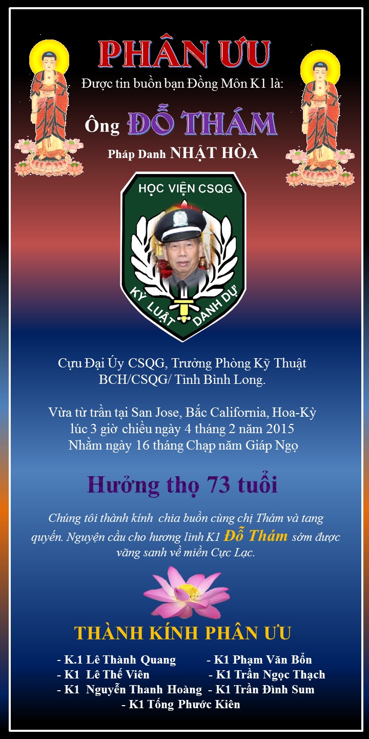 – Phân Ưu của các bạn: K1 Lê Thành Quang -K1 Phạm Văn Bổn – K1 Lê Thế Viên L1Trần Ngọc Thạch – K1 Nguyễn Thanh Hoàng – K1 Trần Đình Sum K1 Tống Phước Kiên.