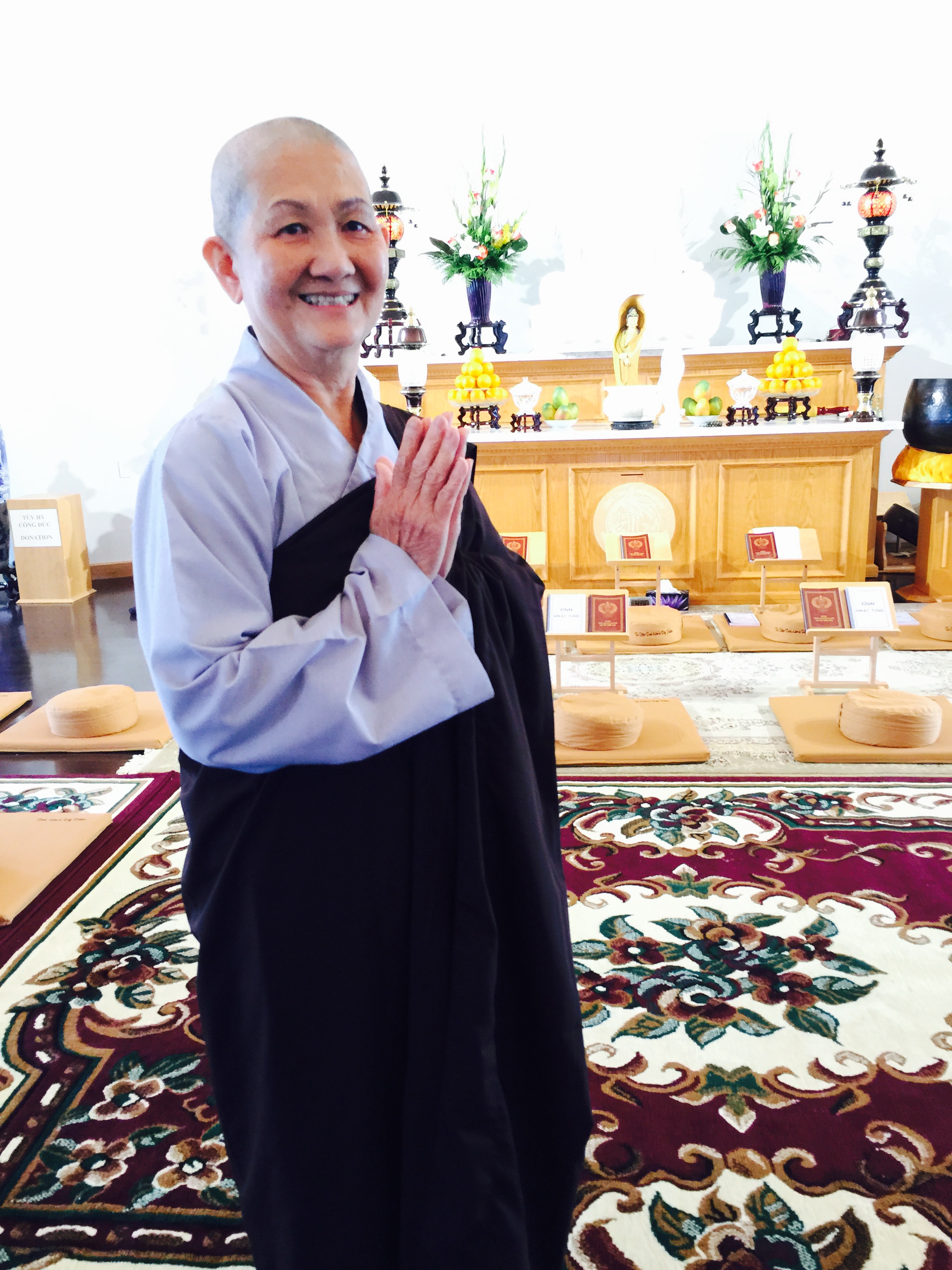 Nhưng tin cuối cùng được biết, nhân mùa Vu Lan năm nay, chị Hai Hạnh sang Canada dự khóa tu học tại Tu viện Tây Thiên của thầy Thích Pháp Hòa. Trong khóa tu nầy có chương trình TU XUẤT GIA GIAO DUYÊN dành cho Phật tử nào phát tâm làm tăng ni thử trong một thời gian 2-3 ngày hay một tuần. Người tu xuất gia giao duyên cũng cạo đầu, mặc áo cà sa giống như quý Tăng Ni. . . Nhưng sau khi hết thời gian đó thì trở lại cuộc sống bình thường ngoài xã hội, cũng chồng chồng, vợ vợ, con con, cũng đi làm kiếm sống, cũng ăn uống như xưa không có gì thay đổi. Chị Hai Hạnh đang phát tâm làm chuyện đó. Tuy là tu thử nhưng cũng rất đáng được kính phục vì chị Hai Hạnh dám hy sinh mái tóc của mình ít ra cũng 4-5 tháng nữa mới mọc ra được như xưa.