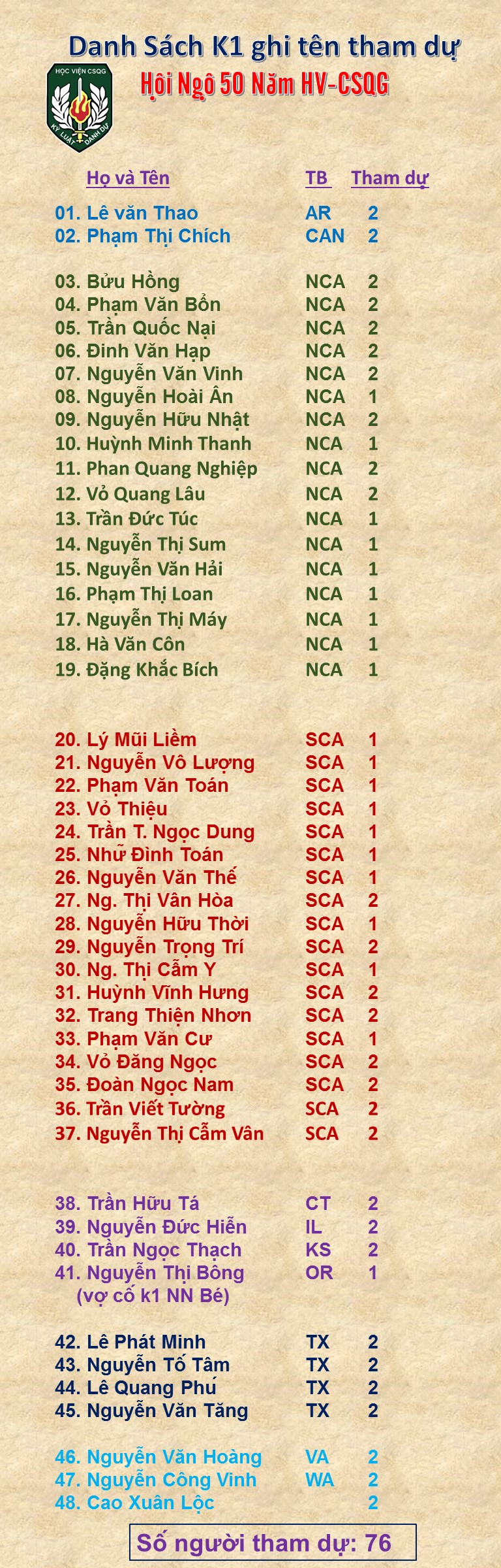 Dach sách k1 về dự 50 năm HV-CSQG