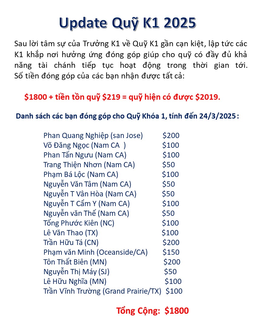 Danh sách các bạn đóng góp cho Quỹ K1 2025